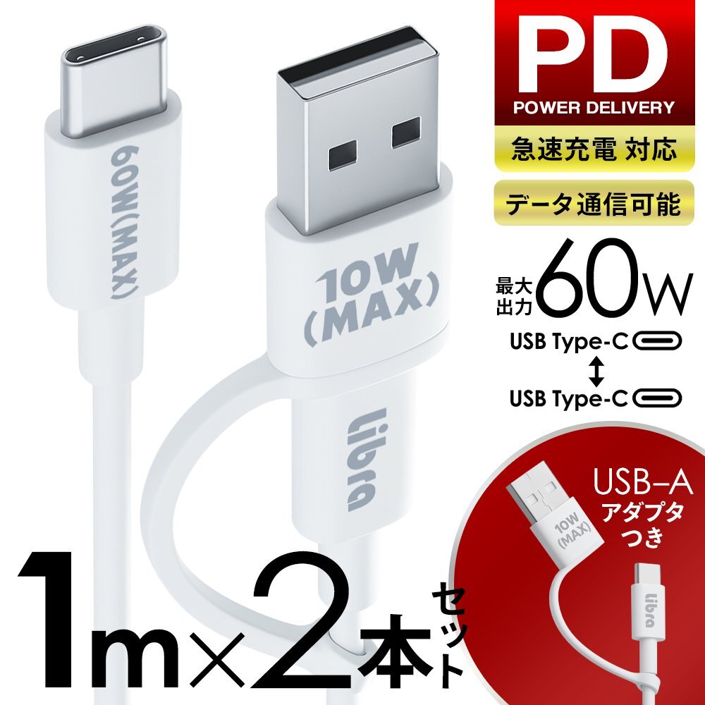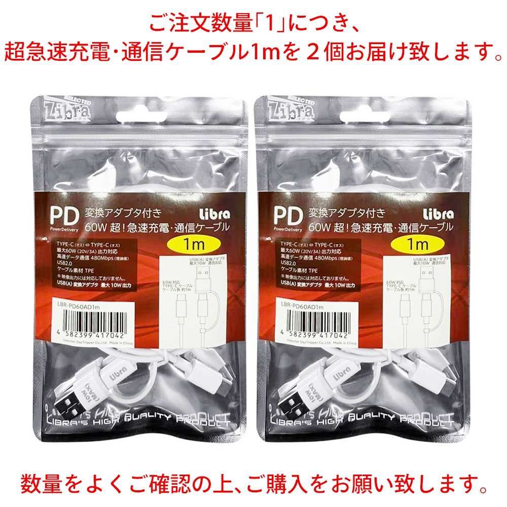 | 60W PD 変換アダプタつき 超!急速充電・通信ケーブル Type-C⇔Type-C 1m×2本セット |
