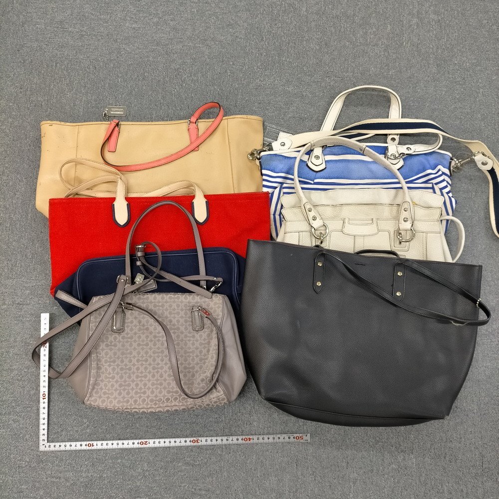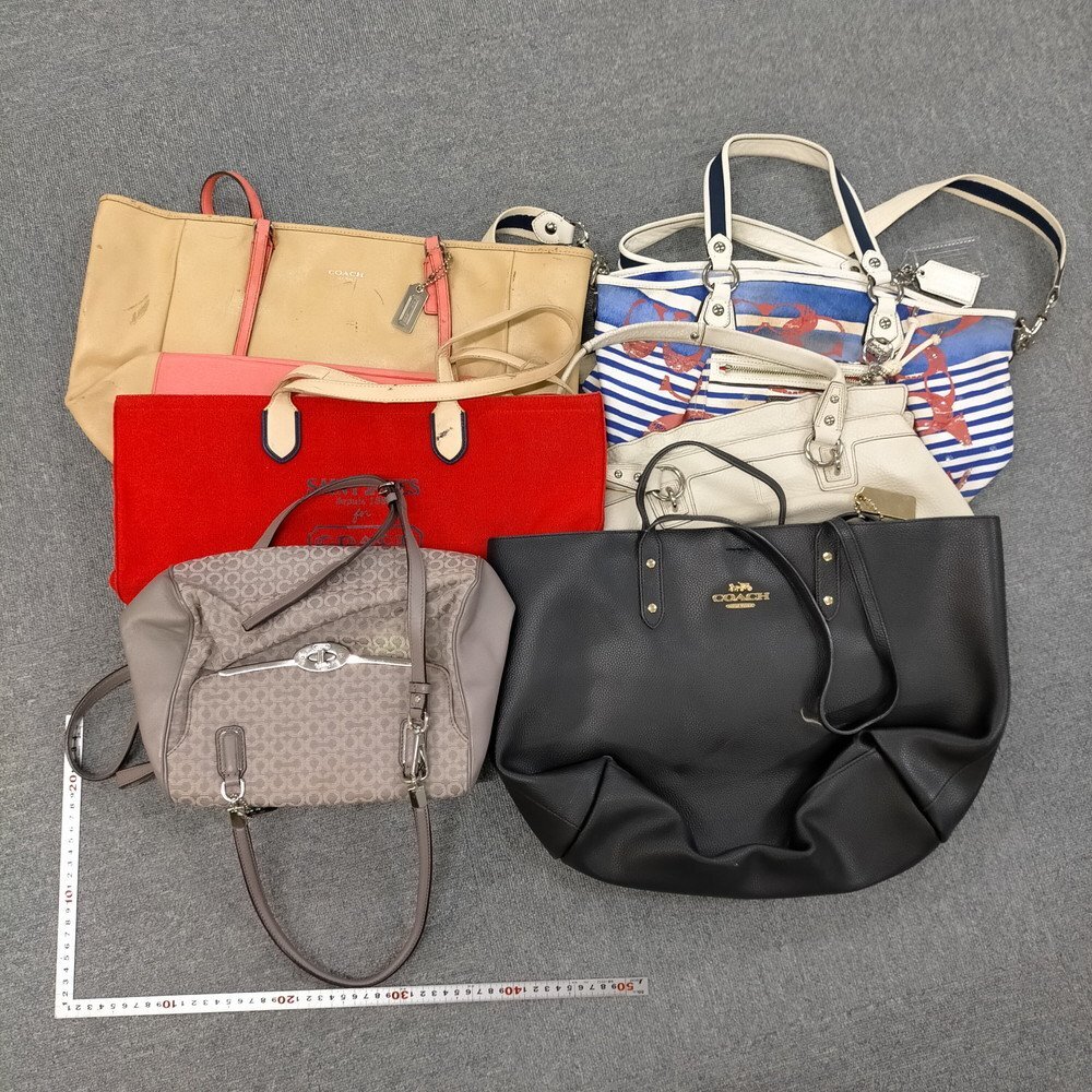 状態備考 : COACH(コーチ)のブラックレザートートやベージュトート、シグネチャー柄ショルダーバッグ、ボーダー柄トートなどを含むバッグ6点セットで、いずれも中古品のため全体的に擦れや汚れ・角スレ・型くずれなど使用感があり特にベージュ系トートには汚れが目立ちますので、状態や色味・サイズ感は必ず写真をご確認のうえ中古品にご理解のある方のみご入札ください。