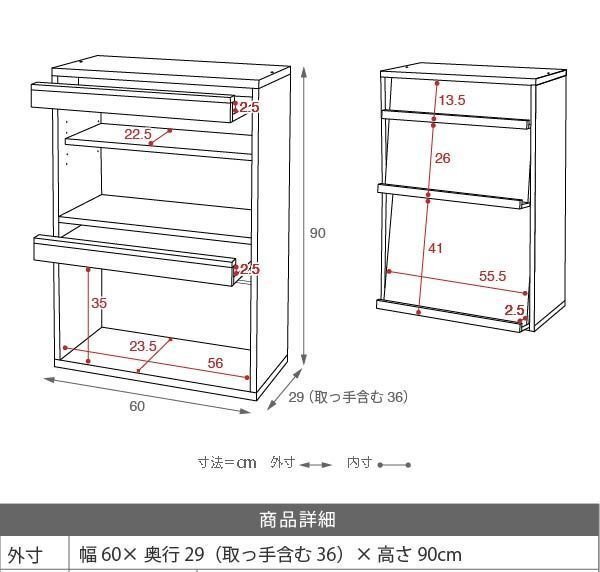 【カラー】 ホワイト、ナチュラル 【サイズ】 <外寸> 幅60×奥行29(取っ手含む36)×高さ90cm <内寸> 上下部:幅56×奥行23.5×高さ35cm 上飾り棚小:幅55.5×奥行2.5×高さ13.5cm 上飾り棚大:幅55.5×奥行2.5×高さ26cm 下飾り棚:幅55.5×奥行2.5×高さ41cm 可動棚:幅56×奥行22.5×厚み1.8cm(3.2cmピッチ5穴) 【材質】 本体:プリント紙化粧合板 【生産国】 ベトナム 【梱包】 サイズ:68×46×23cm、重量:31kg 【その他】 可動棚:1枚 【組み立て品】 お客様による組み立てが必要です。 |