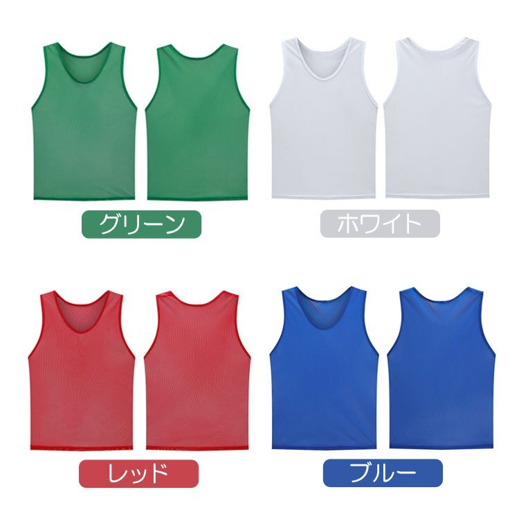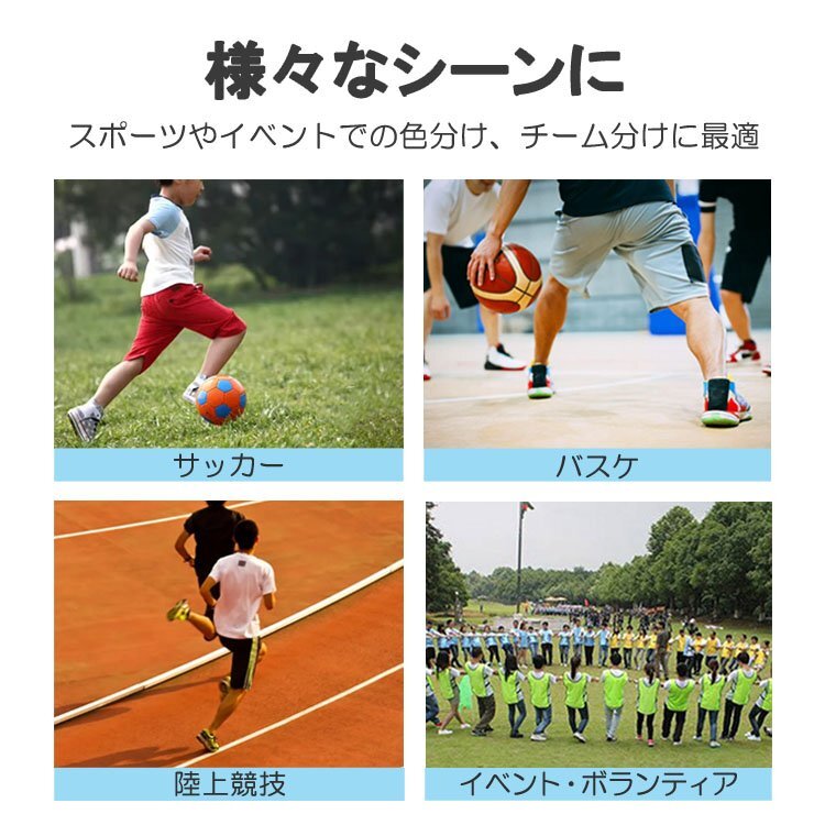サッカーやバスケなどスポーツシーンはもちろん、イベントやボランティアスタッフなど、幅広くご使用いただけるゼッケンベストの5枚セットです。