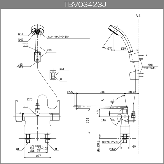 台付サーモスタット混合栓(取り替え兼用) サーモシャワー コンフォートウェーブ TBV03423J1 TOTO GGシリーズ