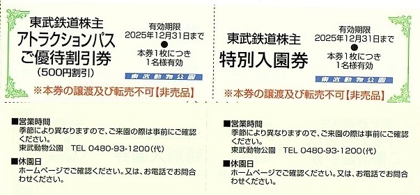 東武鉄道 株主優待券 東武動物公園 入園券+アトラクションパス割引券 1set(単位)~6組迄 2025年12月末迄有効