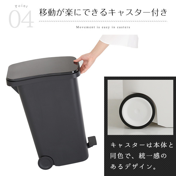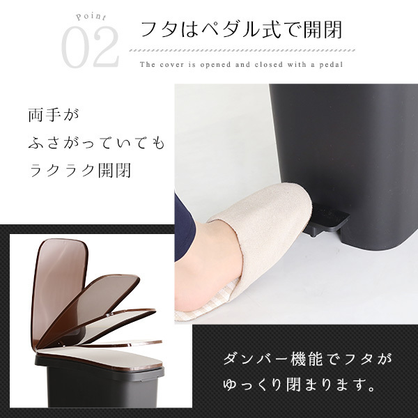 【ポイント】 インテリアの邪魔にならないスタイリッシュなデザインです。 キャスター付きなので、ゴミの回収や掃除の際も移動がスムーズにです。 幅の狭いスリムな形状で、フタはペダル式で両手がふさがっていてもラクラク開閉します。 ダンパー機能付きでゆっくりフタが閉まるので静音で安心です。 |