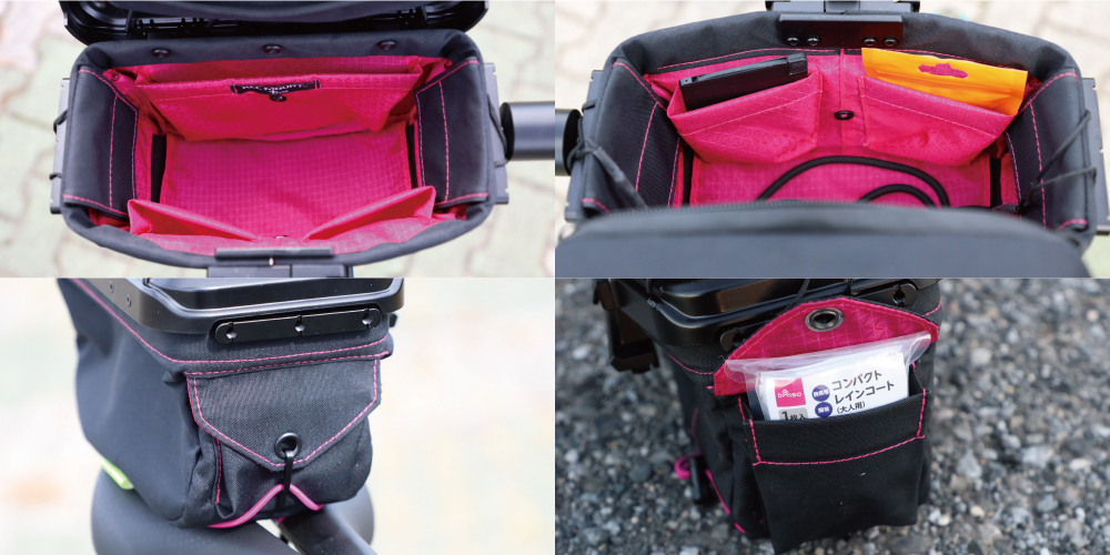 ・走行中でもワンタッチでフタの開閉が可能で、バッグ自体の脱着も簡単。自転車を降りた後も肩掛けバッグのように持ち運ぶ事も出来ます。
