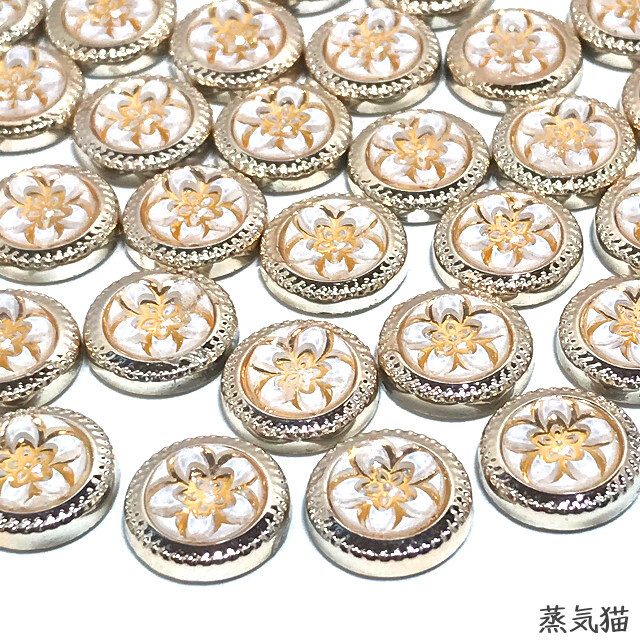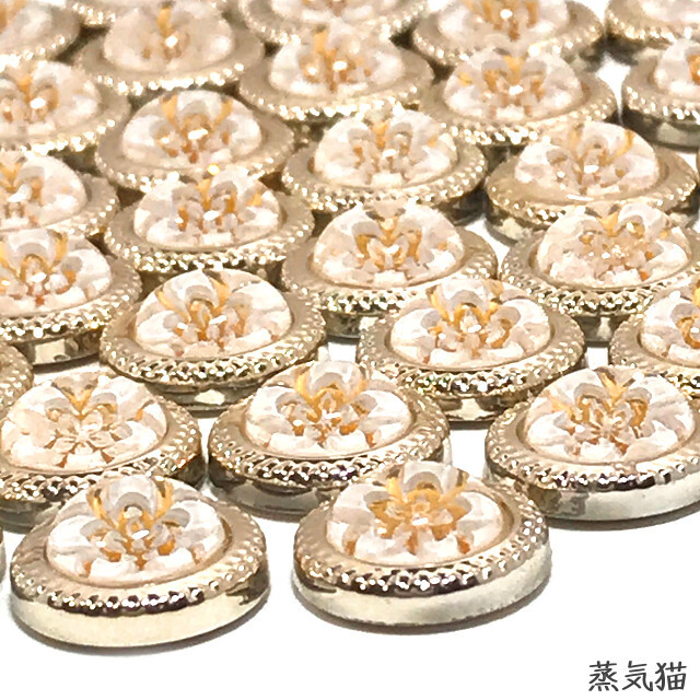 a1520 フラワー柄ゴールド枠カボション 12mm 20個です。アンティークボタンな雰囲気の可愛いアクリルカボションパーツです。白地にゴールド花柄(平面)の上にこんもりとクリア部分が被さり、その周りをゴールド部分で縁取りされているようなデザインです。