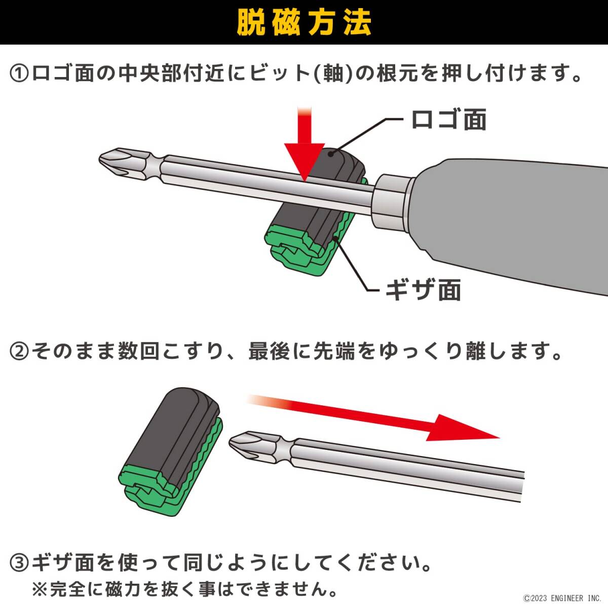 強力マグネットでネジを落とさず確実に保持できる極短サイズのネジキャッチ。 【特徴】 全長16.2mmのミニサイズで、電動工具用などの短いビットに使用できます。 段付ビットやトーションビットにも使える可動式。 先端のくぼみにより、ネジを確実に保持します。 六角軸と丸軸のドライバー・ビットに対応。 ※脱磁は完全に磁気を抜くことはできません。 【用途】 設備機器やOA機器のメンテナンスに。 【スペック】 入数:3 対応サイズ:4~6.35mm 全長:16.2mm 幅:13mm 高さ:14.2mm 色:ライムグリーン 重量:4g 材質:本体/PC