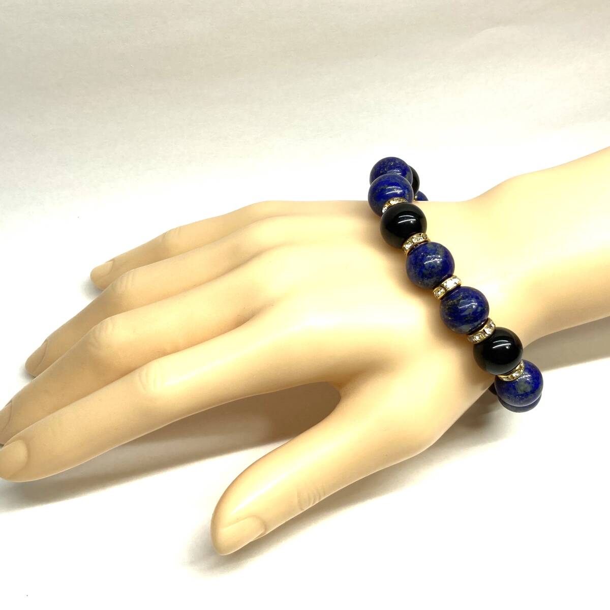 こちらは、ラピスラズリとモリオンを組み合わせたパワーストーンブレスレットです。間にはロンデルを挟み高級感あるデザインに仕上げております。程よくインパクトがある12mm玉を使用して内周約18cmです。(サイズ変更の場合は取引ナビにてご連絡をお願いします。) 数に限りがございますので気になる方はお早めにどうぞ。