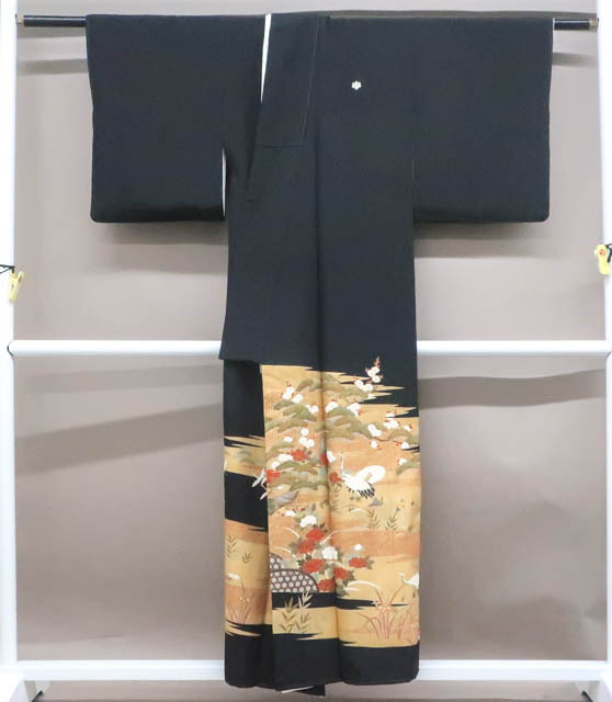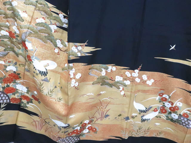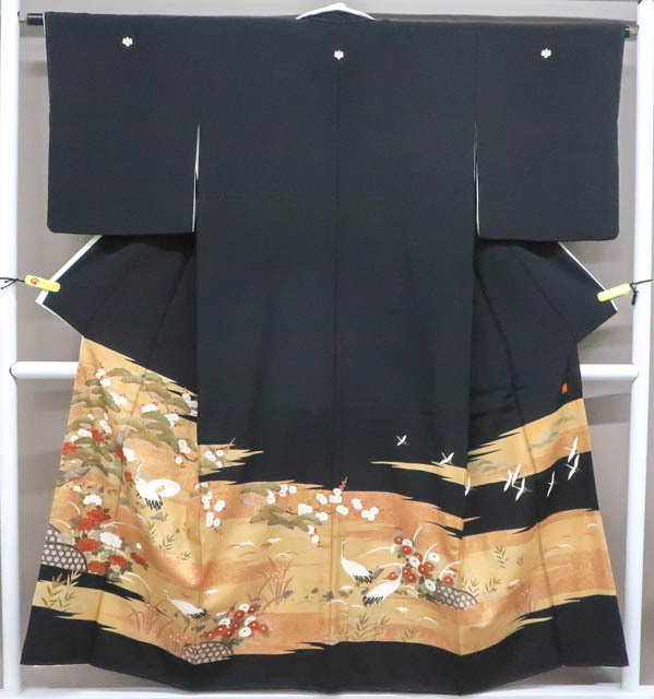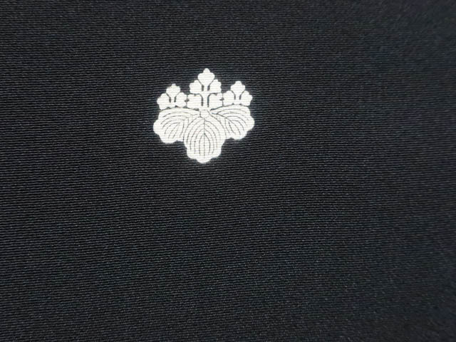 リサイクル商品のため、右袖、両袖口に薄汚れがございますが着用可能なお品です。 地色は 黒です。 1枚目の画像が近いお色かと思われます。 素材は正絹です。 |