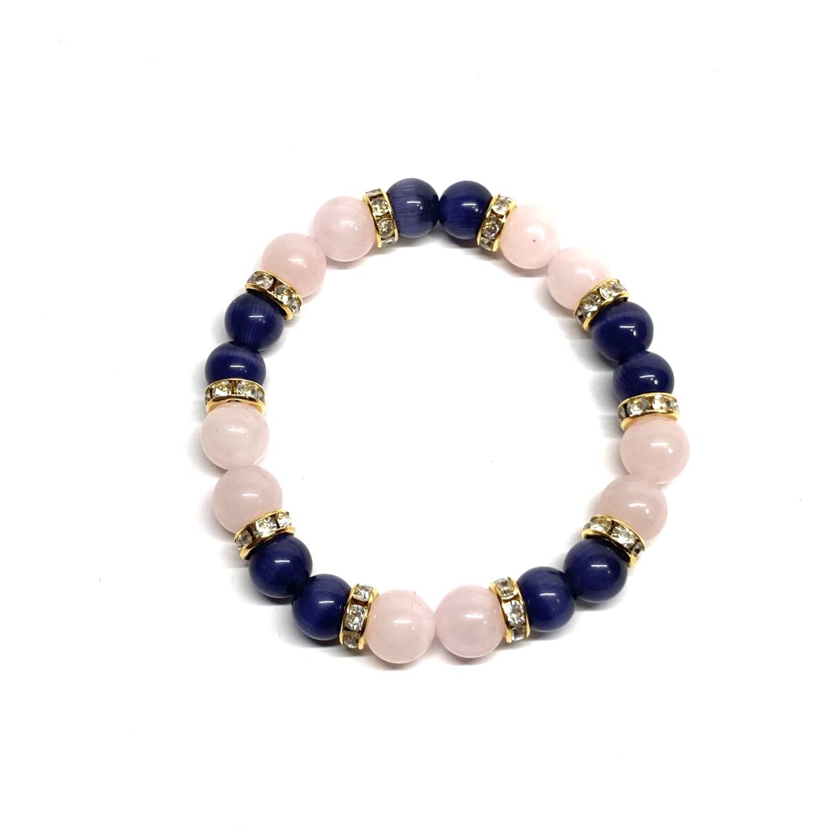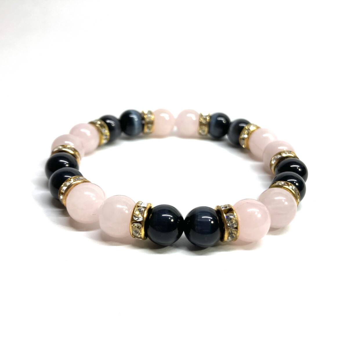 こちらは、8mm玉のキャッツアイとローズクォーツを使用したパワーストーンブレスレットです。間にはロンデルを挟み高級感ある大人っぽいデザインに仕上がっています。サイズは内周約15cmです。気になる方は是非この機会にどうぞ。