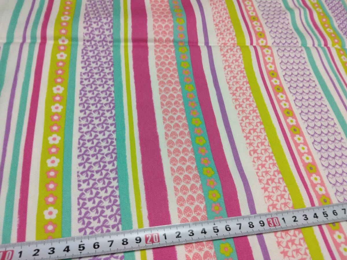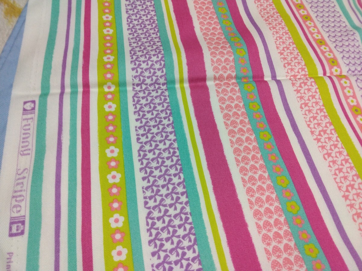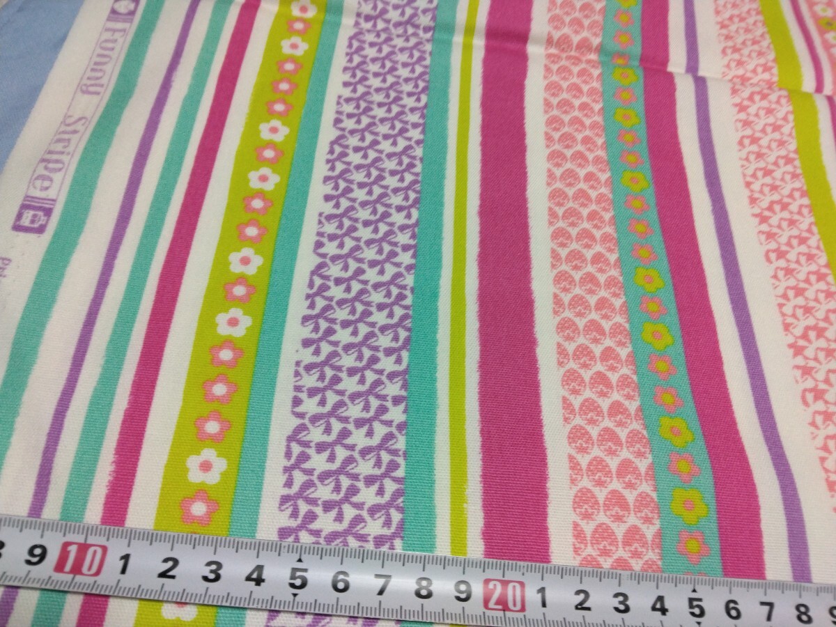 Funny Stripeのレトロポップなイチゴやリボンやお花などのカラフルなストライプ柄のオックス生地です。112×48センチの金額になります。