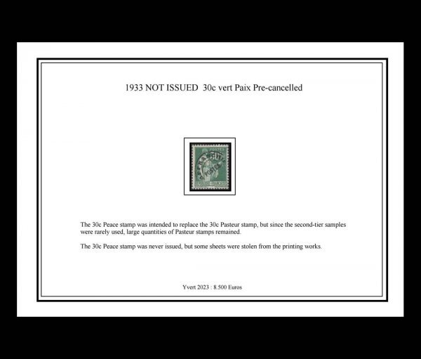フランス・1933年 発行されていない切手・事前キャンセルされたPaix 30c・ MNH・カタログ高評価