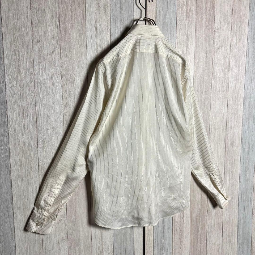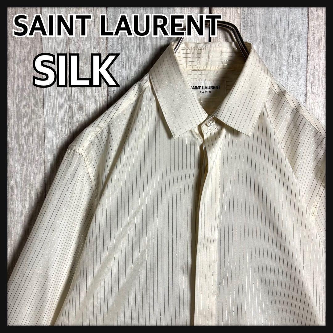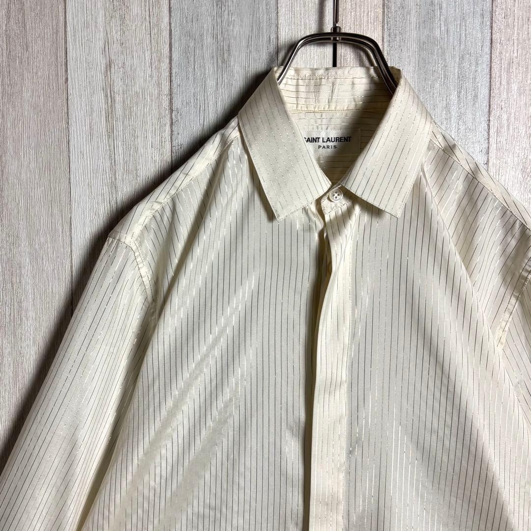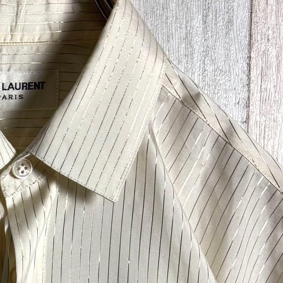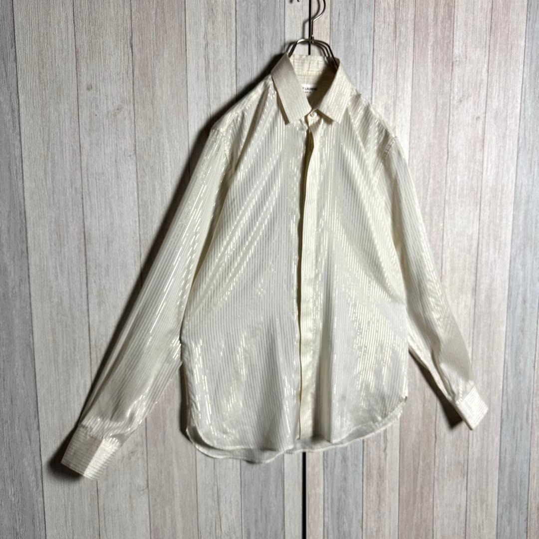 【未使用級・極美品・シルク】イタリア製 SAINT LAURENT PARIS サンローラン ゴールドストライプ L/S・長袖 シャツ アイボリー 36 M相当