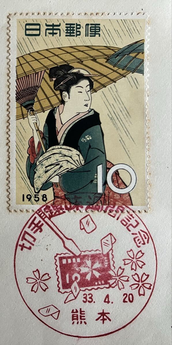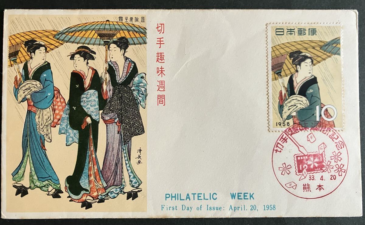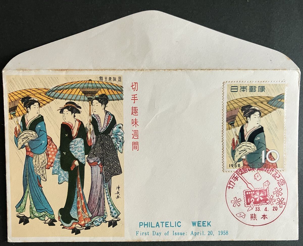 [FDC]切手趣味週間 雨中湯帰り10円(鳥居清長画)1958.4.20 初日カバー