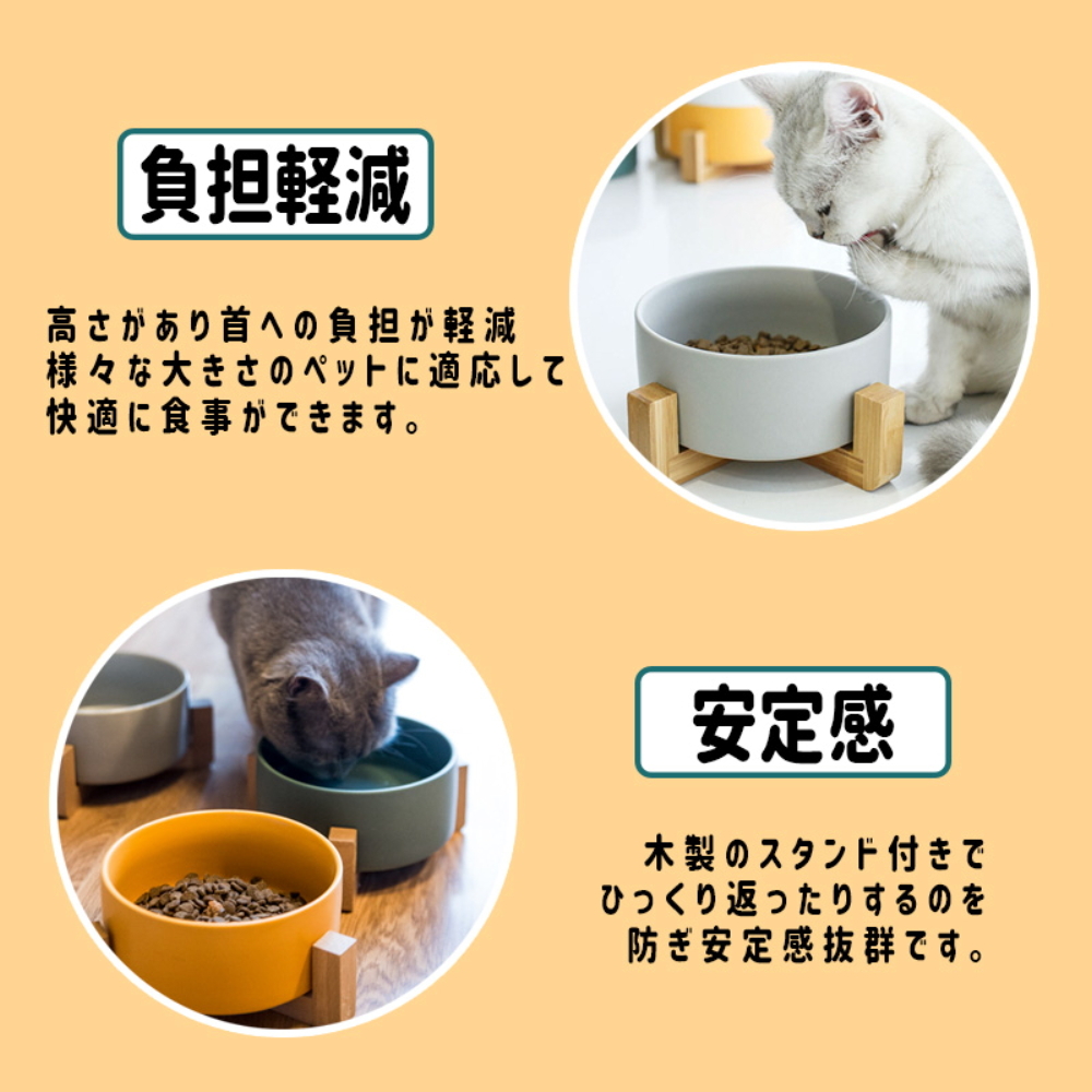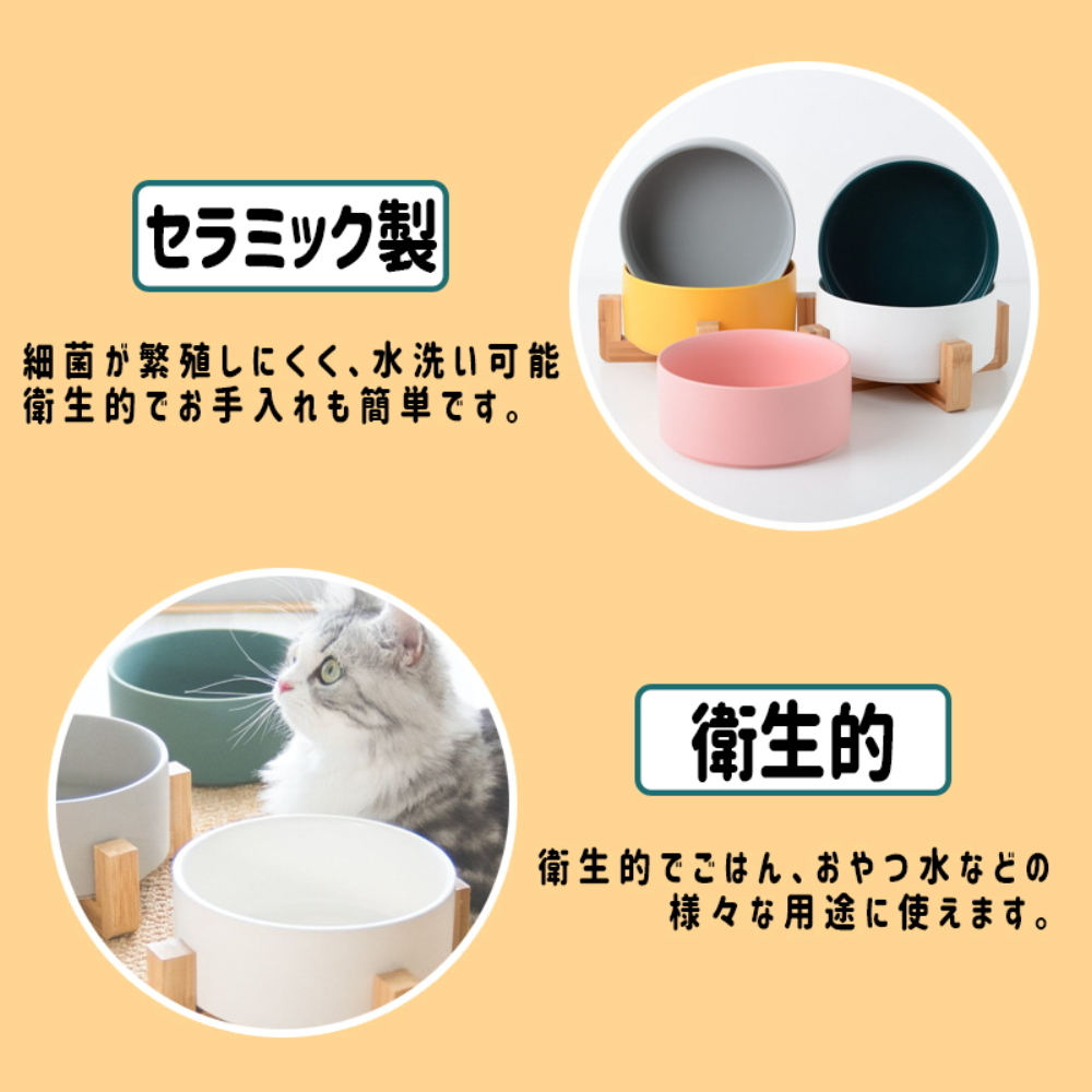 陶器と天然木という耐久性に優れた素材を使うことで、毎日の使用にも対応しやすく長く使える点も魅力です。熱や冷水にも比較的強い陶器素材は季節問わず扱いやすく、フードや水以外にもスープ、ゼリー状のごはんなどにも対応できます。幅広い使い方ができるため、ペットのライフスタイルに合わせた用途が広がります。