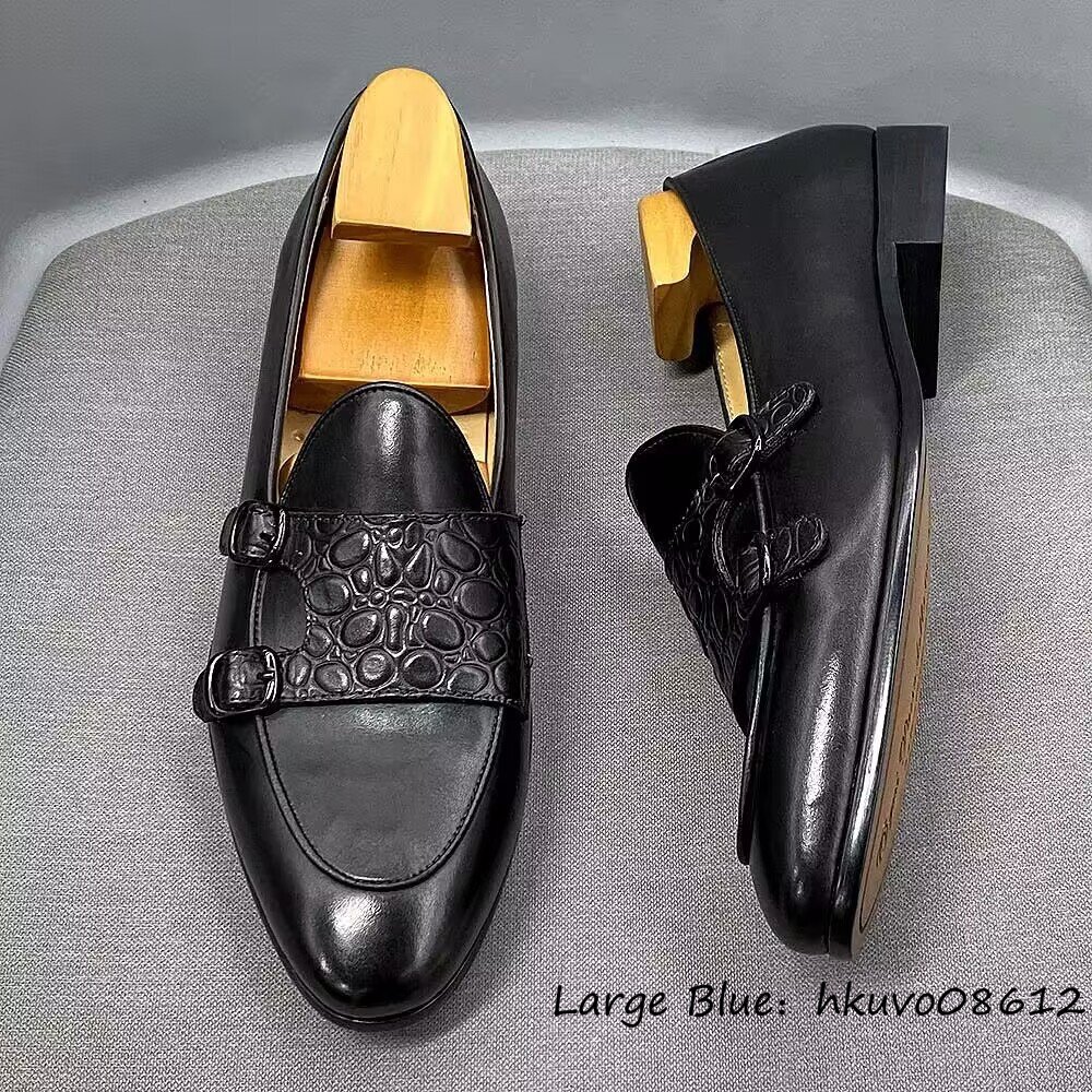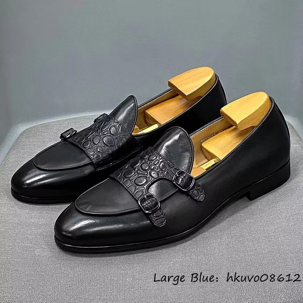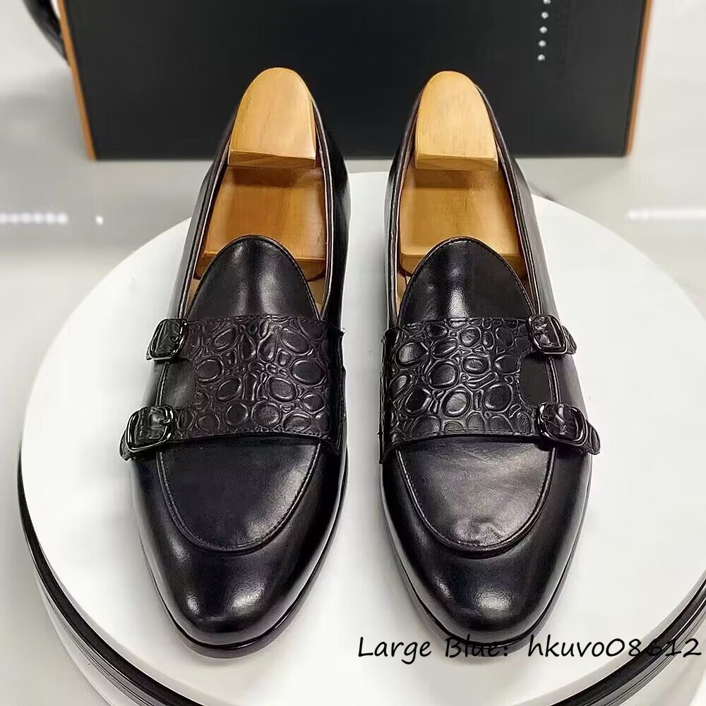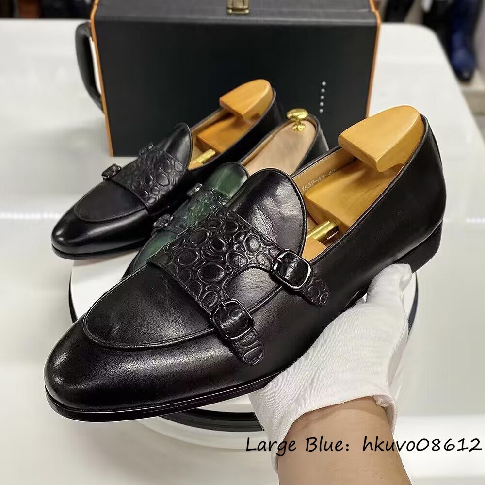 定価9万■ダブルモンクストラップ 鰐柄 革靴 ビジネスシューズ 本革 職人手塗り上げ レザーシューズ ドレスシューズ 牛革 ブラック 27.5cm