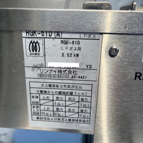 下火式焼物器 リンナイ(Rinnai) RGK-61DLP プロパンガス 業務用 中古/送料別途見積