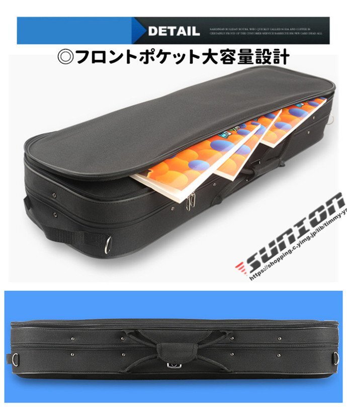 【商品スペック】●防撥水800Dオックスフォード●ショルダーストラップ2本付属●弓2本収納可能●タイプ(裏地色) ブラック グリーン●サイズ 4/4 3/4 1/2 1/4※画像はイメージです。バイオリン本体は付属しておりません。