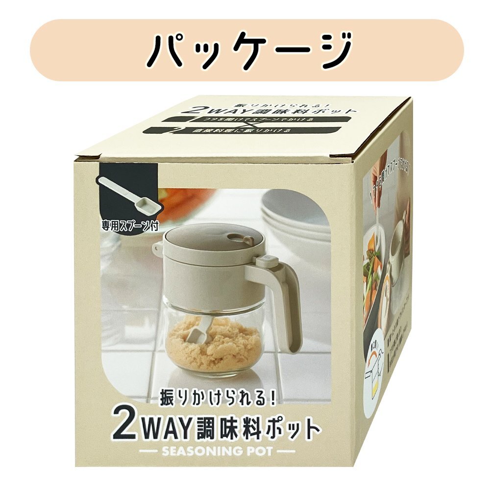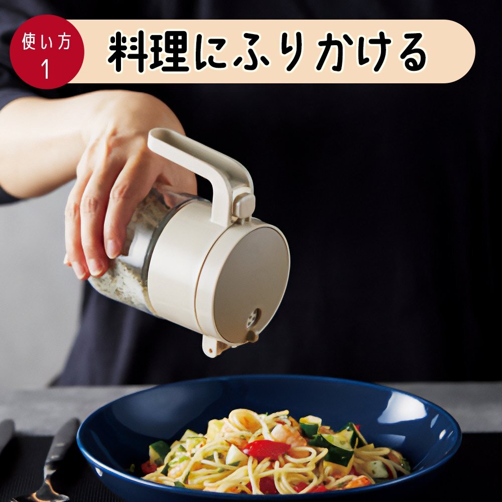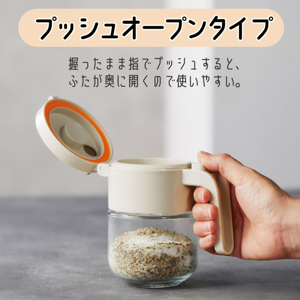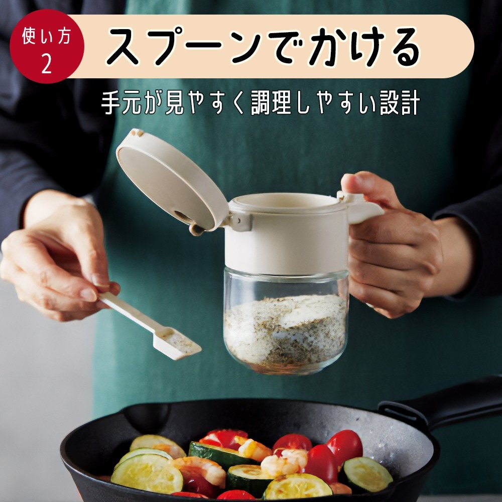 | フタを開けてスプーンですくうだけでなく、 逆さまにして直接振りかけることもできる。 便利で機能的なガラス製の調味料ポットです。 ●使い方2通り 【スプーンでかける】 使いやすいプッシュオープンタイプ。 握ったまま指でプッシュするとふたが奥に開くので、 手元が見やすく調理しやすい設計です。 【直接料理にふりかける】 ふたを回して振りかける量を3段階に調節ができます。 料理に合わせて使い分けることができます。 ●容器は清潔で丈夫なガラス製 ●専用スプーン付き |