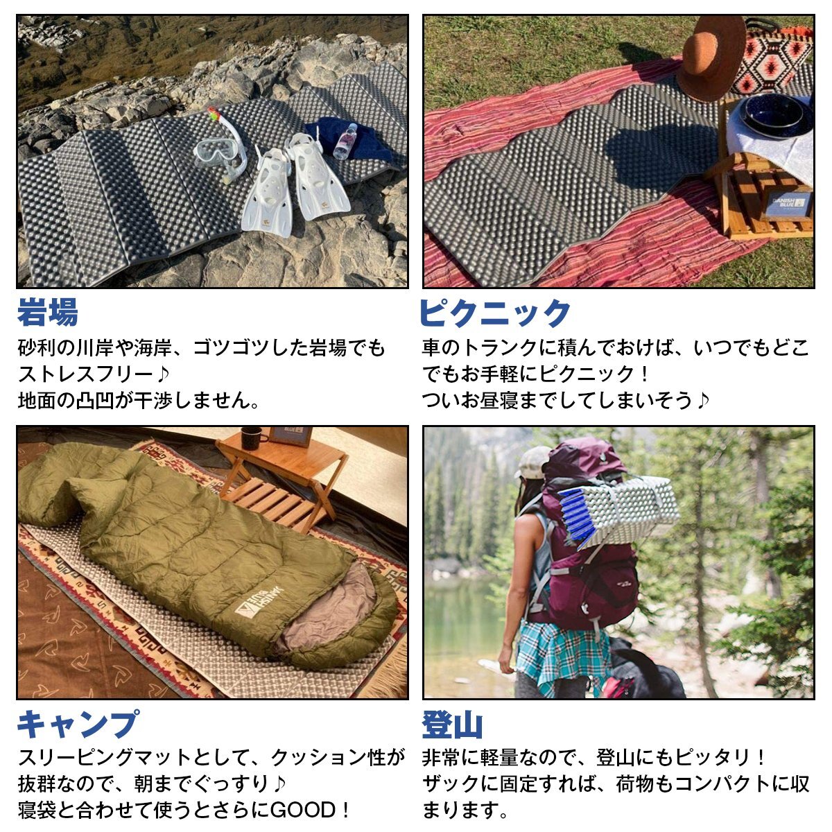 ・寝袋の下に敷くマットレスとしてはもちろん、ヨガマット、ピクニック、野球観戦、