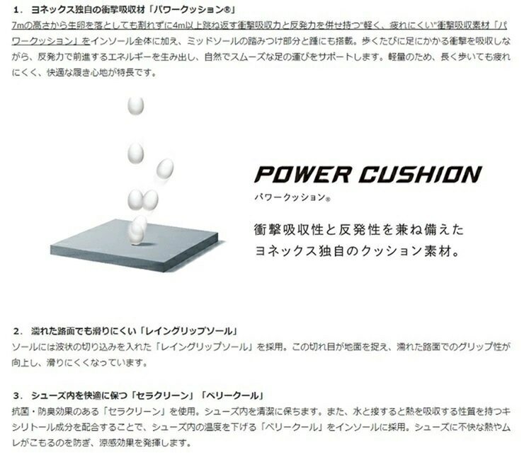 | 7mの高さから生卵を落としても割れずに4m以上跳ね返す 「パワークッション」搭載 。疲れにくい!!ヨネックスのパワークッション、ウォーキングシューズです。 すっきりスタイルなのに足入れやわらか。 定番人気モデル。つま先ゆったり3.5Eタイプ 濡れた路面も滑りにくい レイングリップソール ■撥水ストレッチPUレザー 伸縮性が高く、ソフトな履き心地ながらもフィット感はしっかりとした人工皮革。 様々な甲の高さや足幅にも柔軟に適応します。 ■セラクリーン 抗菌・防臭効果 抗菌・防臭効果を発揮し、シューズ内を清潔に保ちます。 ■ベリークール 裏面のパワークッションは格子状に成型。表面は水分と接する熱を吸収する「キシリトール」でムレを軽減。 ウェーブが足の滑りを防止し、快適な履き心地。 ■レイングリップソール 波状の切れ目が地面を捉え、濡れた路面のグリップ性が向上し、滑りにくくなりました。 ■ハイパーライトソール 摩耗しやすい部分とその他の部分で素材を使い分け、ミッドソールには軽量の「スーパーフェザーライト」を用いて丈夫さと軽さを両立しました。 | |