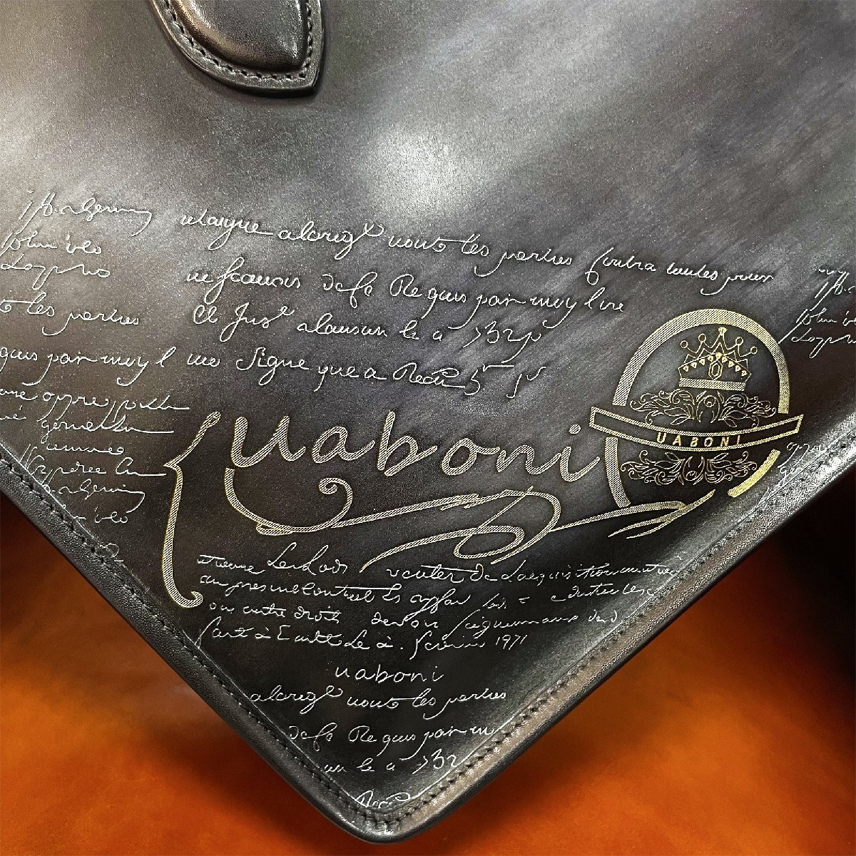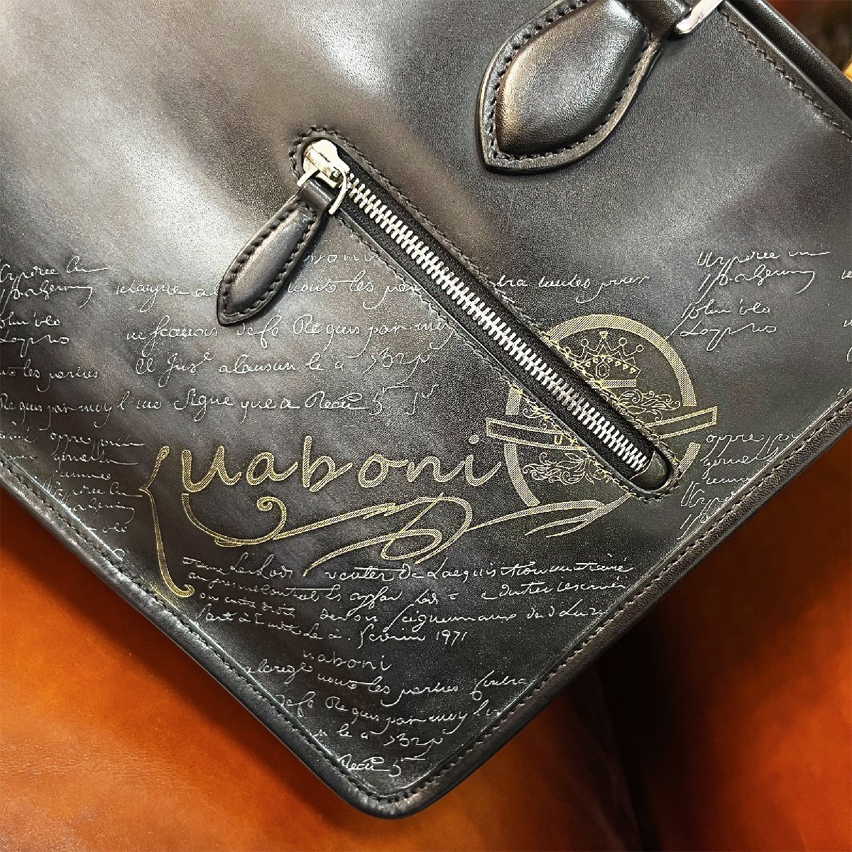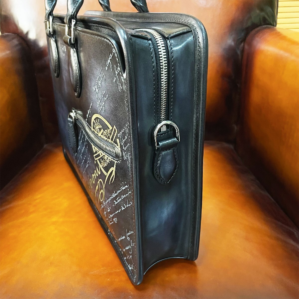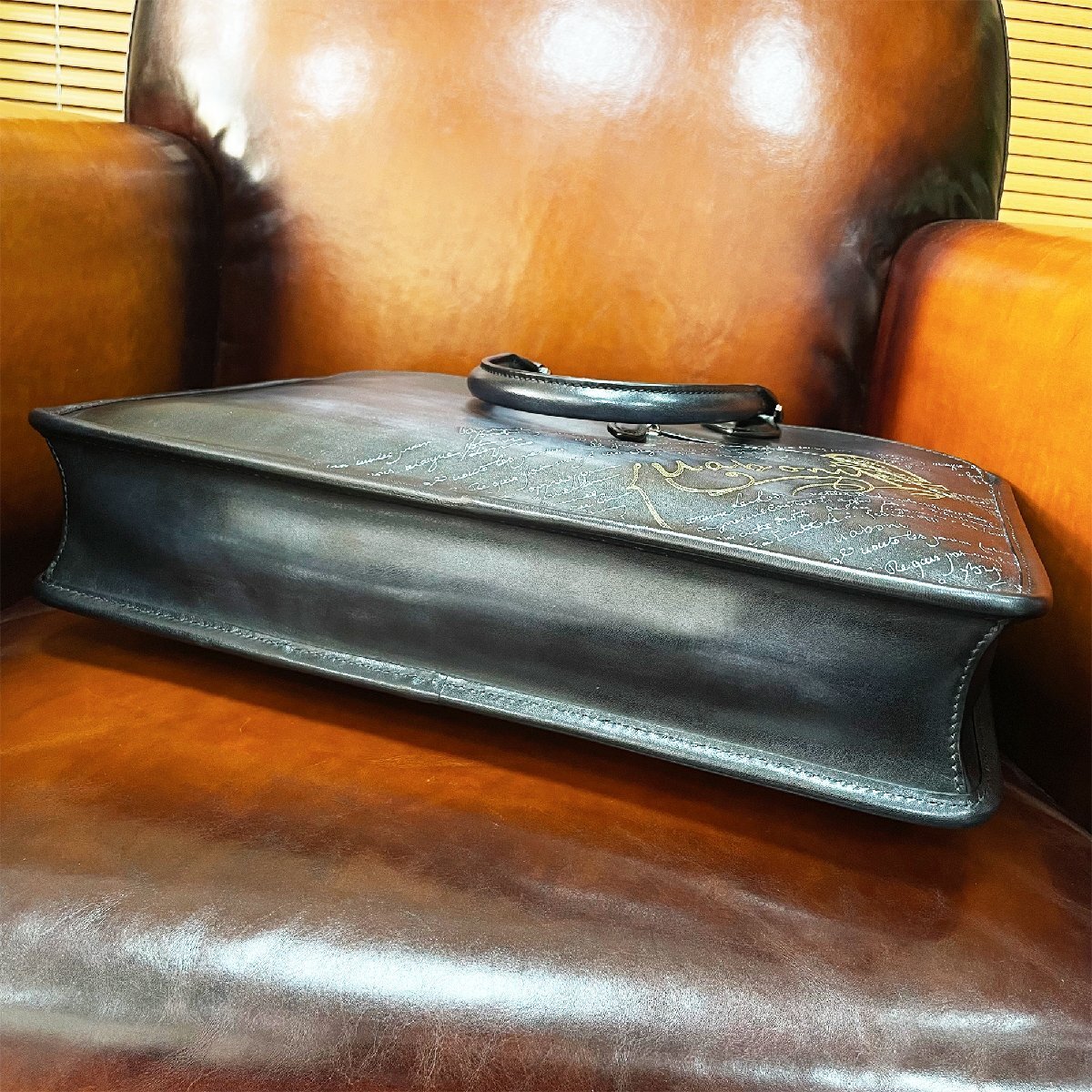 染料の開発成功は製作の一番重要な問題の解決に繋がり、職人が一つ一つの工程にこだわり作り上げた牛革ブリーフケースです。一番こだわりの工程はカリグラフィーの彫り込みと革の着色です。