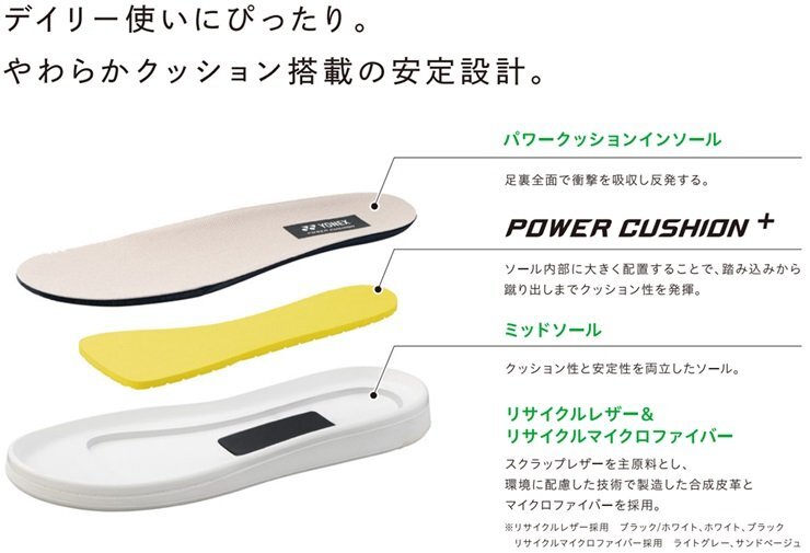 | 12mの高さから生卵を落としても割れずに6m以上跳ね返す 「パワークッションョンプラス」搭載 。疲れにくい!!ヨネックスのパワークッション、ウォーキングシューズです。 かかとから指先まで全面フォロー! パワークッションプラスで快適ウォーク ヨネックス独自の衝撃吸収反発素材「パワークッションプラス」を搭載し、弊社ウォーキングシューズのコンセプトである「軽い。疲れにくい。ひざにやさしい。」を追求した「パワークッション 121」を2023年9月下旬より発売いたします。 本製品は、やわらかいクッション性に加え、足にやさしい設計を採用。ファスナーなしのシンプルな紐タイプで、男女共通でお使いいただけるデイリースニーカーです。 最大の特徴は、ミッドソールに搭載した、12mの高さから落とした生卵が、割れずに6m以上跳ね返る ※素材「パワークッションプラス」です。さらに、インジェクションソールを採用し、優れたグリップ力と耐摩耗性で快適歩行をサポートします。 シューズ底は、起伏を持たせた構造でグリップ性能を高め、優れた安定性を実現。 アッパー素材には、リサイクルレザーを使用し、柔らかな履き心地で、環境と足にやさしい設計としました。 高いクッション性と安定性で足にやさしく、シンプルなデザインの本製品は、日常の様々なシーンでお使いいただけます。 ワイズ:3.5E 重量:《片足》約220g(23.5cm)、約270g(26.0cm) | |