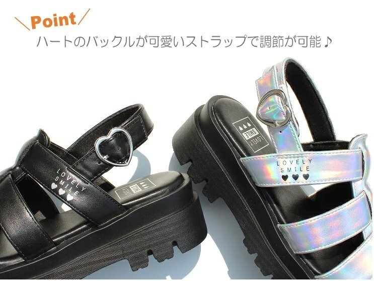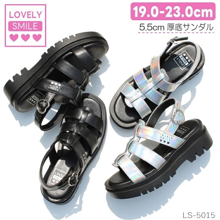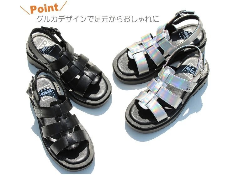 | ガールズ 5.5cmの厚底サンダル♪ グルカデザインが今っぽオシャレ! ●存在感のあるボリュームソールはスタイルアップ効果もバツグン☆ ●ハートの可愛いバックル付きストラップでカカト側の調節が可能です。 ●柔らかいインソールで疲れづらく快適な履き心地! ●靴下を合わせても可愛いスタイルに♪ ●光が当たるとオーロラのように偏光に光るオーロラカラーと、 オールブラックがクールで合わせやすいブラックカラーの2色展開。 ●重さは21.0cmで片足約295gです。 | |