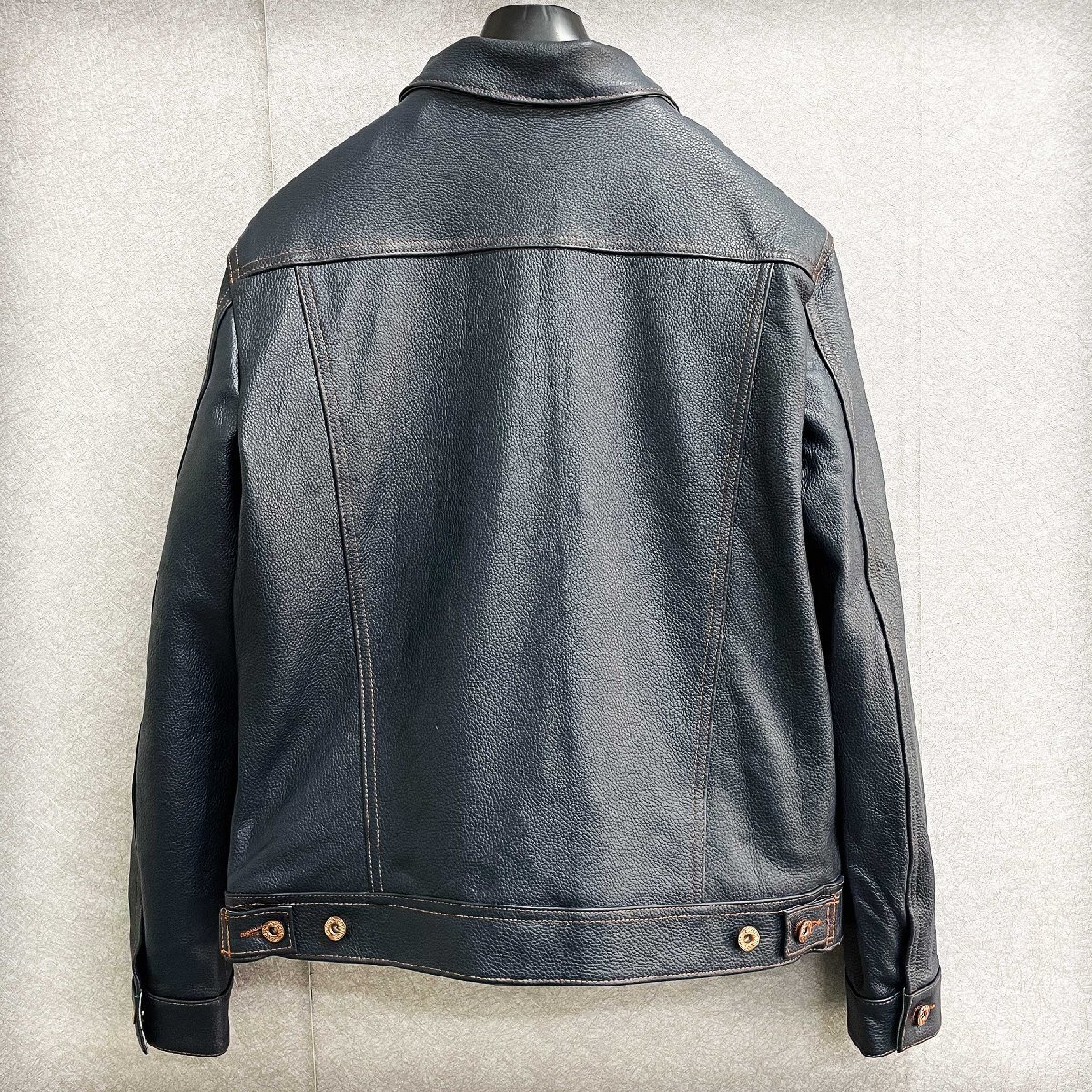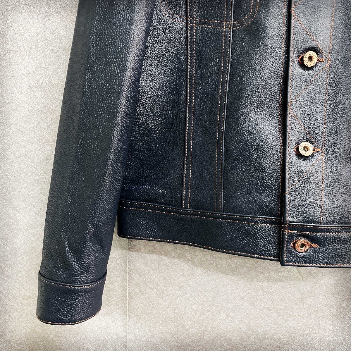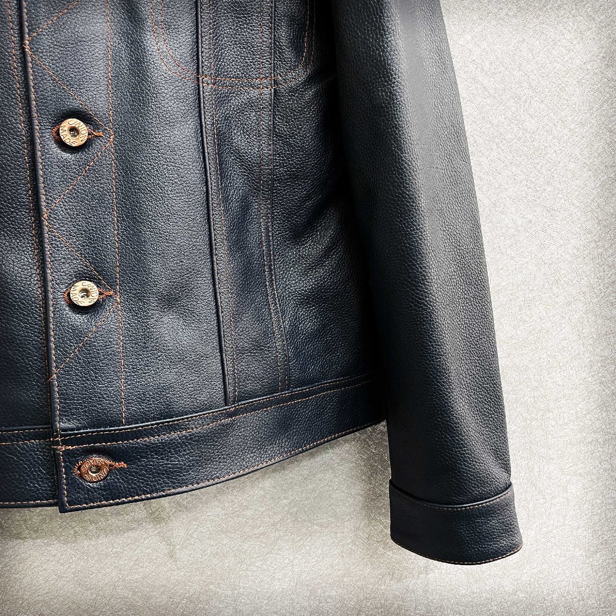 高品質牛革の生地で重量感のある質感と、ハードで男らしい雰囲気が特徴。体に沿うようなシルエットがスタイルアップへ一押ししてくれます。大きめの銀具ボタン等の部品が程よいアクセントとなり、デザインは細部まで拘っており非常にお洒落な作りとなっております。
