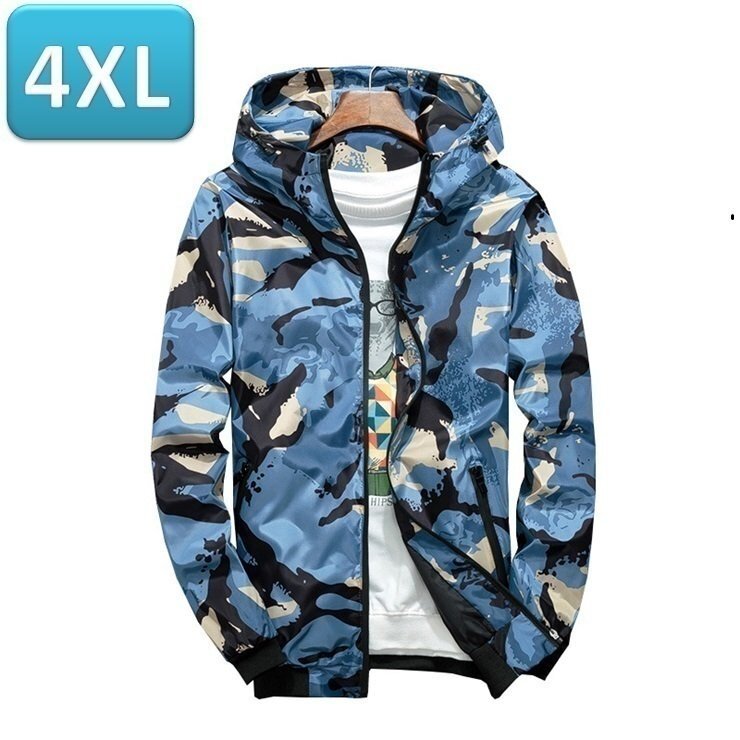 ☆お買得 【191】 迷彩 ウィンドブレーカー フード付き 青迷彩 4XL メンズ ナイロン カモフラ 柄 アウトドア 防風 軽量 ジャケット