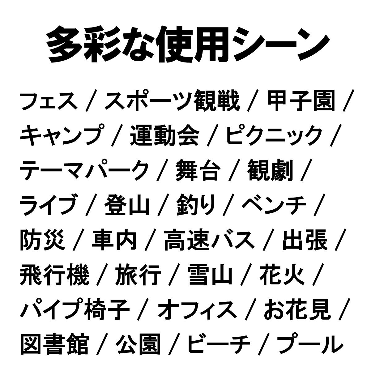 ■用途:アウトドア・旅行・釣り・ベビーカー・カー用品・学校・オフィス・リモート・出張・スポーツ観戦・フェス・甲子園・キャンプ・ピクニック・テーマパーク・舞台観劇・ライブ・登山・ベンチ・車内・高速バス・パイプ椅子・お花見・花火大会・図書館・公園・カフェ・ビーチ・雪山・プール・運動会など広いジャンルで活躍します。