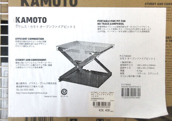| 内 容 | ■プリムス オープンファイアピットS 焚き火台(P-C738060) ■使用サイズ:約38×45×H32.5cm ■収納サイズ:約38×51.5×H6cm ■重量:約6.1kg ■材質:スチール、ステンレス ■グリル(焼き網)付属 ◆参考価格 26400円相当 腐食に強いステンレスとパウダーコーティングされた スチール製のボディで、 未使用時はフラットに収納することが 可能なポータブルファイアピットです。 素早くセットして地面にダメージを与えずに 焚き火を楽しむことができます。 バーベキューをする際に必要なグリルも標準装備しています。 |