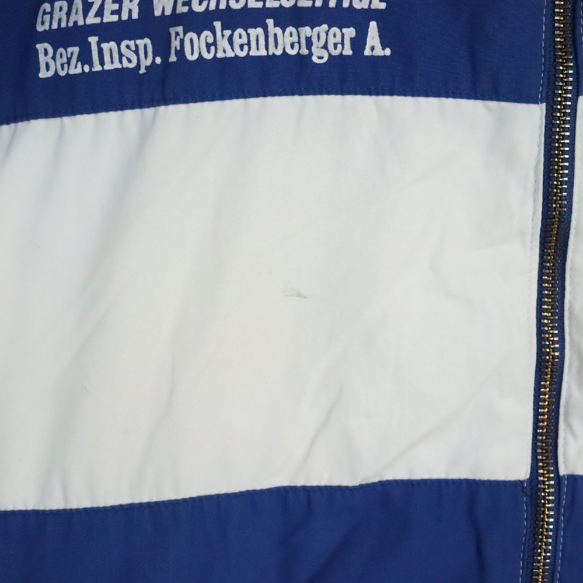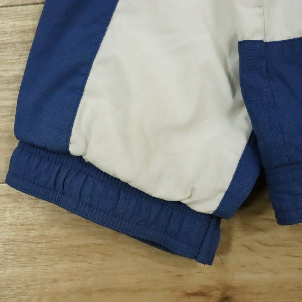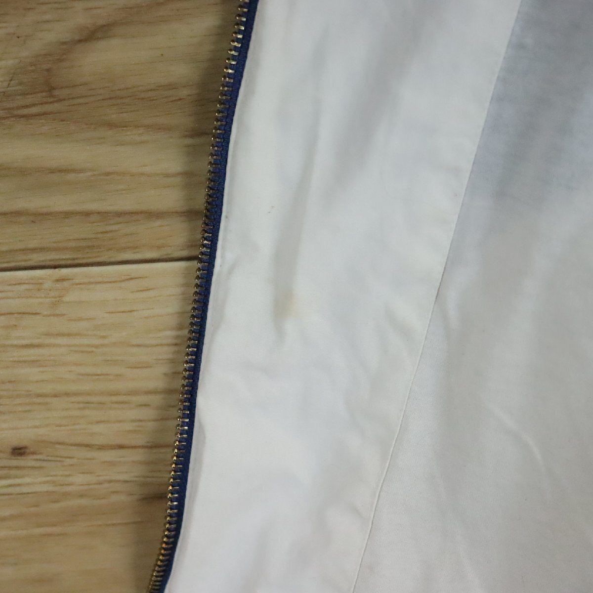 中古品です。使用感があります。ファスナーの引手(スライダー)パーツに塗装剥がれとゴム部分に亀裂、所々擦れと汚れがあります。袖先ゴムが劣化して伸びています。