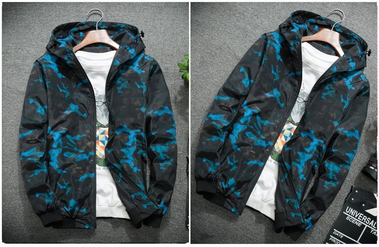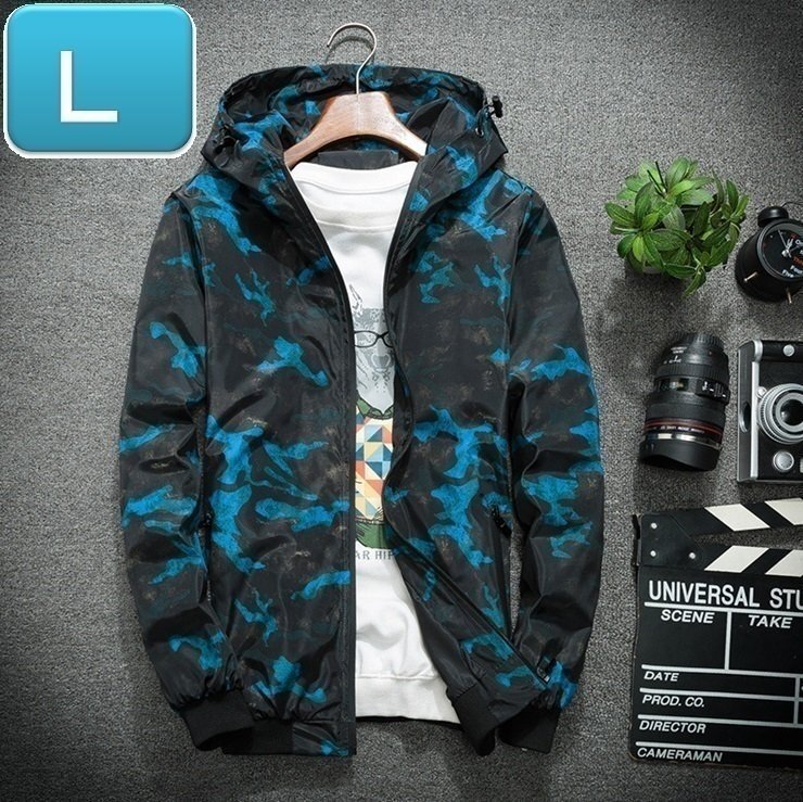☆お買得 【190】 迷彩 ウィンドブレーカー フード付き 青迷彩 L メンズ ナイロン カモフラ 柄 アウトドア 防風 軽量 ジャケット