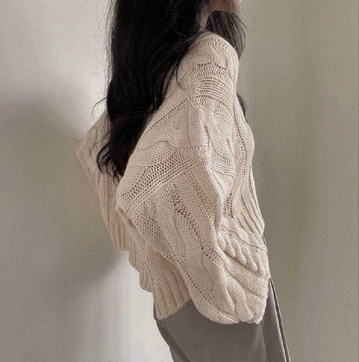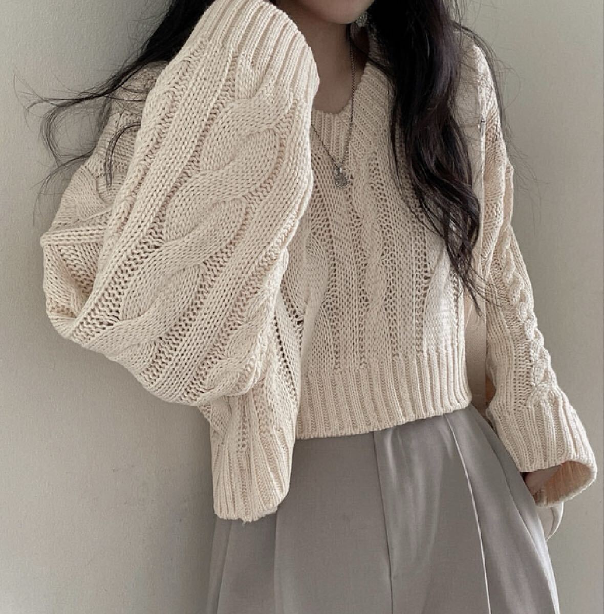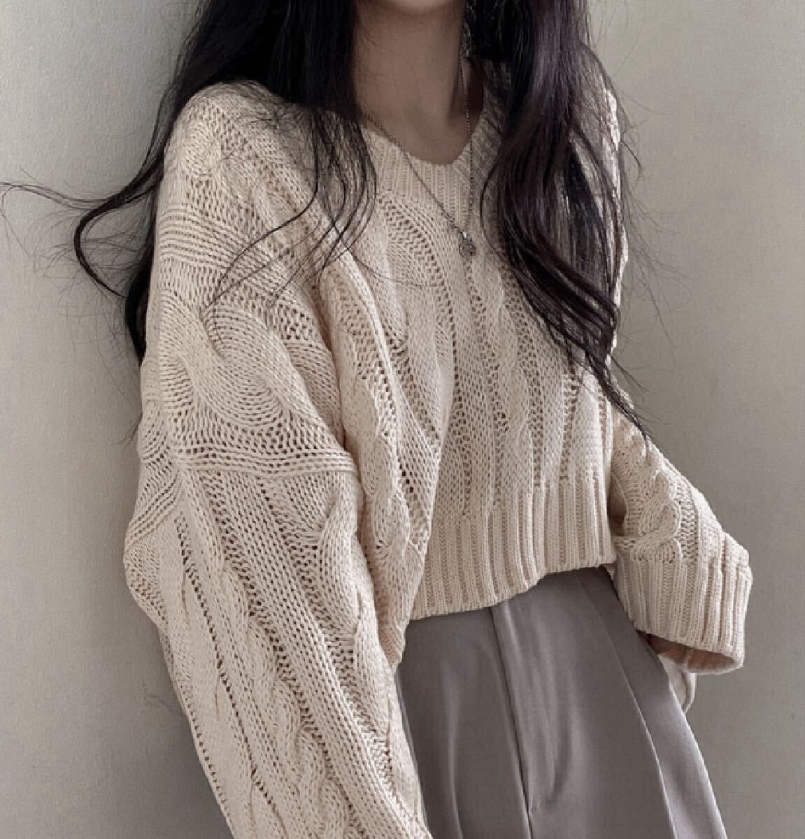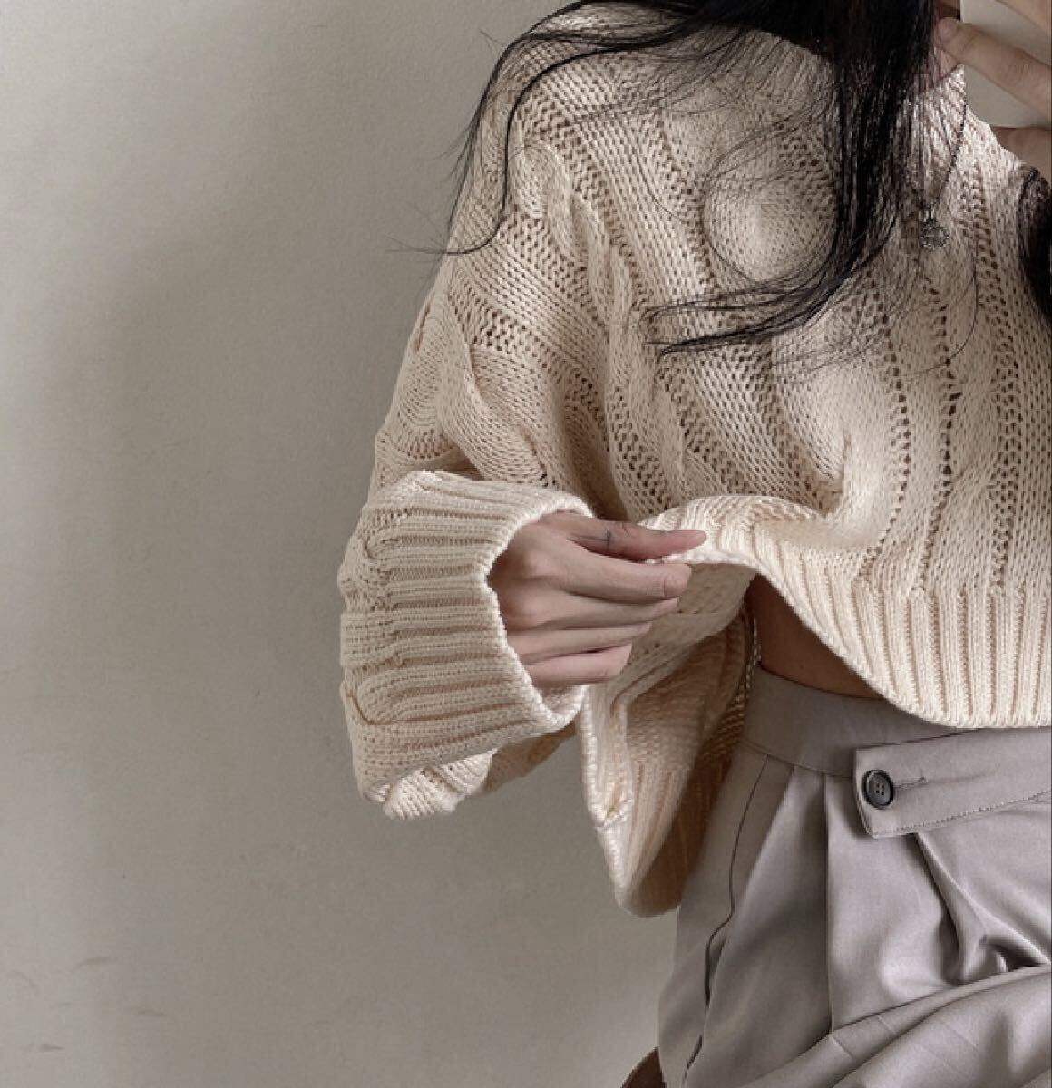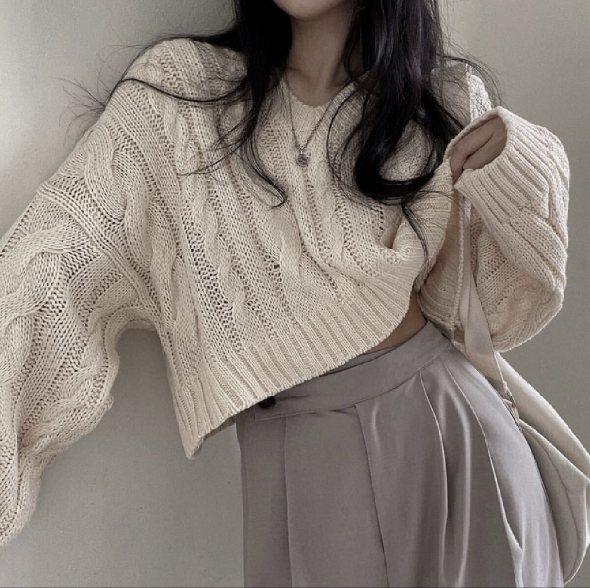 フェミニンな雰囲気のあるケーブル編みのニットセーターです。