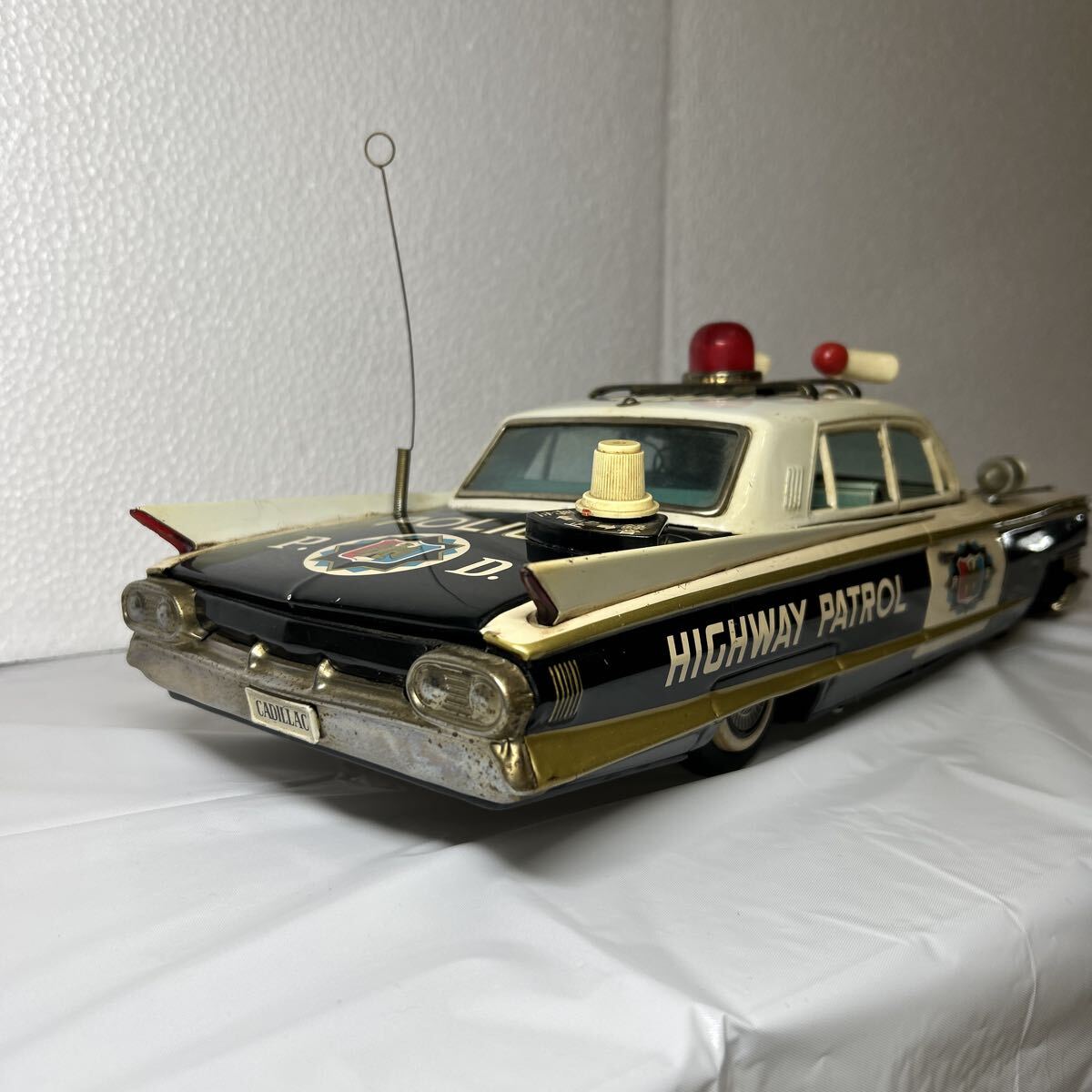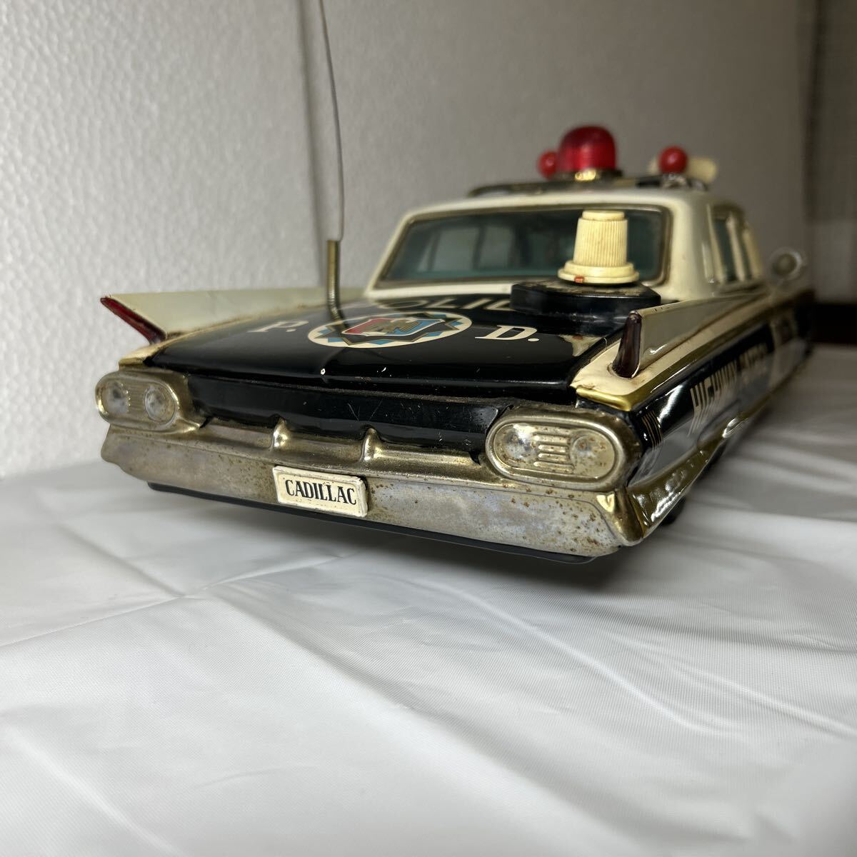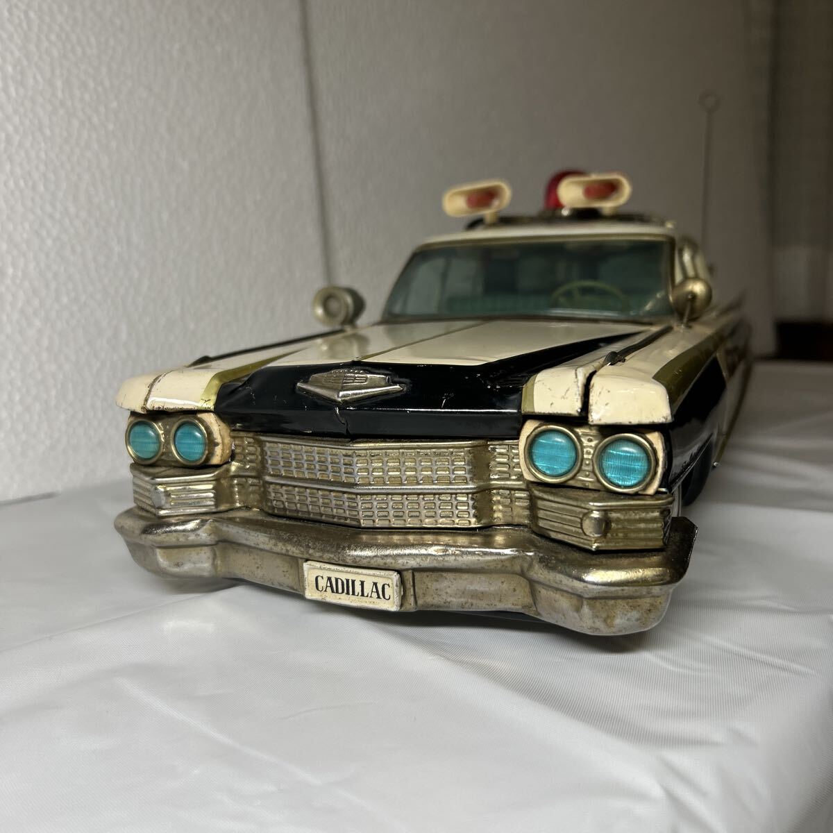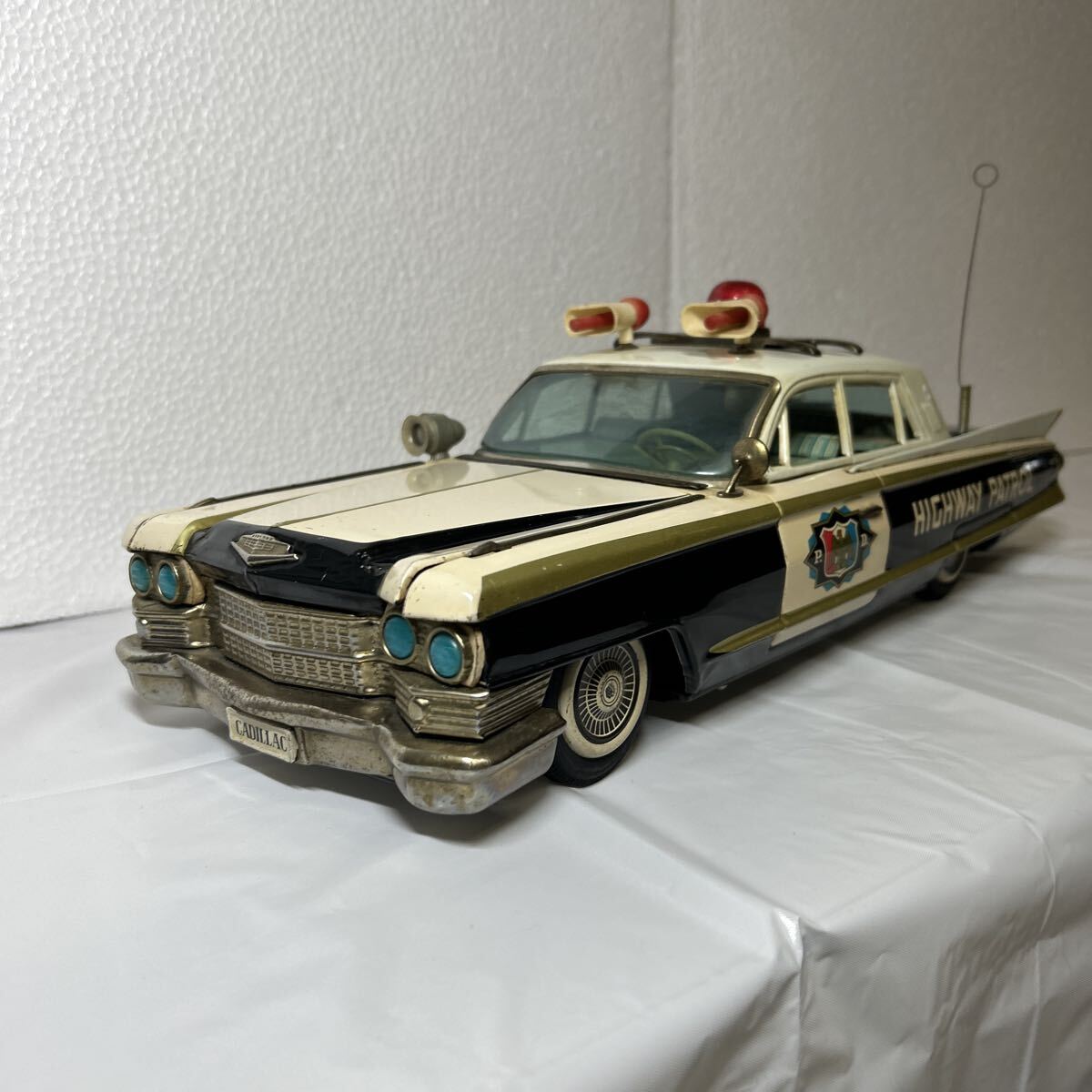 バンダイ製のキャデラックパトロールカーで全長は、41センチ有ります。回転灯、アンテナ、フェンダーミラー、サイレント等、欠品しやすいですが、全て当時のまま残っています。また、ウインドウに割れはなく、錆、へこみ等も目立つものはございません。