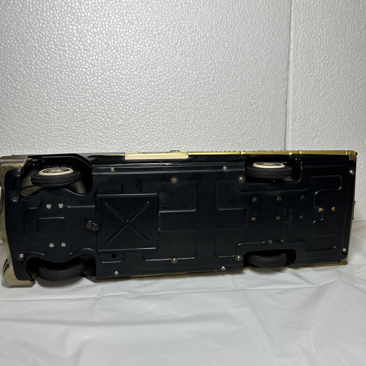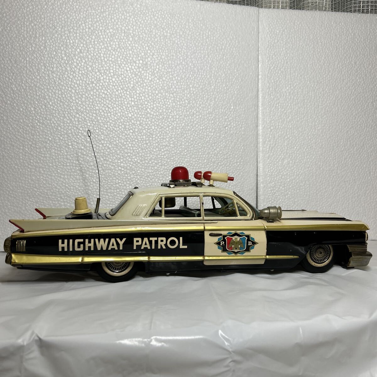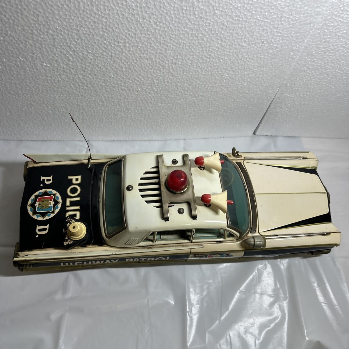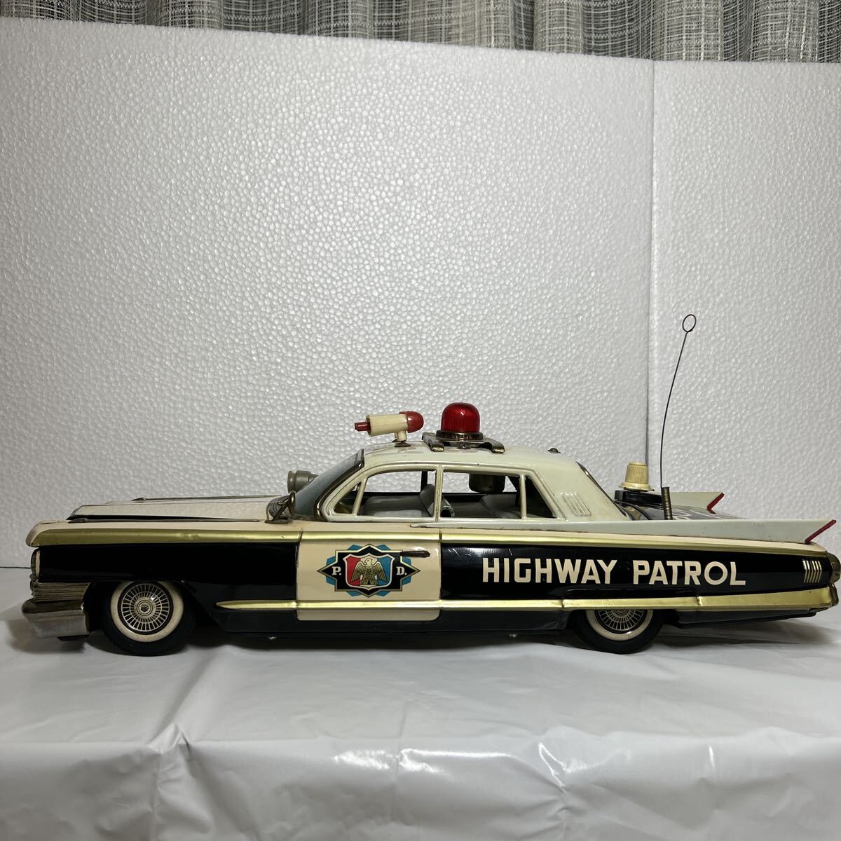 バンダイ製のキャデラックパトロールカーで全長は、41センチ有ります。回転灯、アンテナ、フェンダーミラー、サイレント等、欠品しやすいですが、全て当時のまま残っています。また、ウインドウに割れはなく、錆、へこみ等も目立つものはございません。