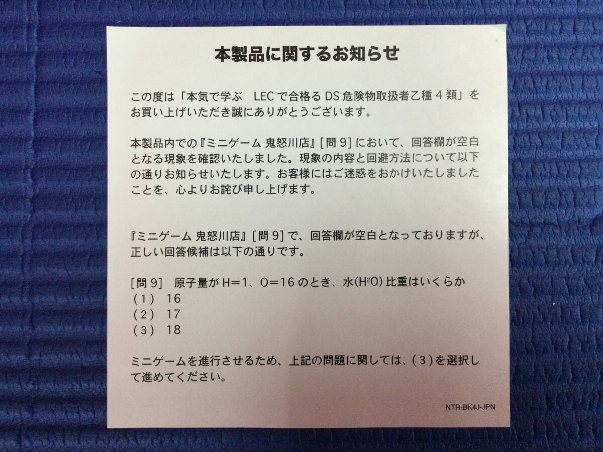 DSソフト「本気で学ぶ LECで合格る DS危険物取扱者 乙種4類」です。 付属の説明書付き。 説明書に一部僅かな汚れがございます。 商品の詳細は画像をご確認下さい。 【商品状態】 ■商品は中古品となりますので商品状態を理解した方のみご落札下さい。 ■神経質な方や完璧な商品をお求めのお客様は入札をお控えください。 ■ばら売りはいたしませんのでご了承ください。 ■商品の画像につきましては、パソコン ディスプレイの環境や設定によっては商品のカラー等が実物と異なって表示されることもございます 。 ■その他、ご不明点などございましたらお気軽にご連絡お待ちしております。 ■注意事項をご一読頂きご了承上、ご入札願います。 |