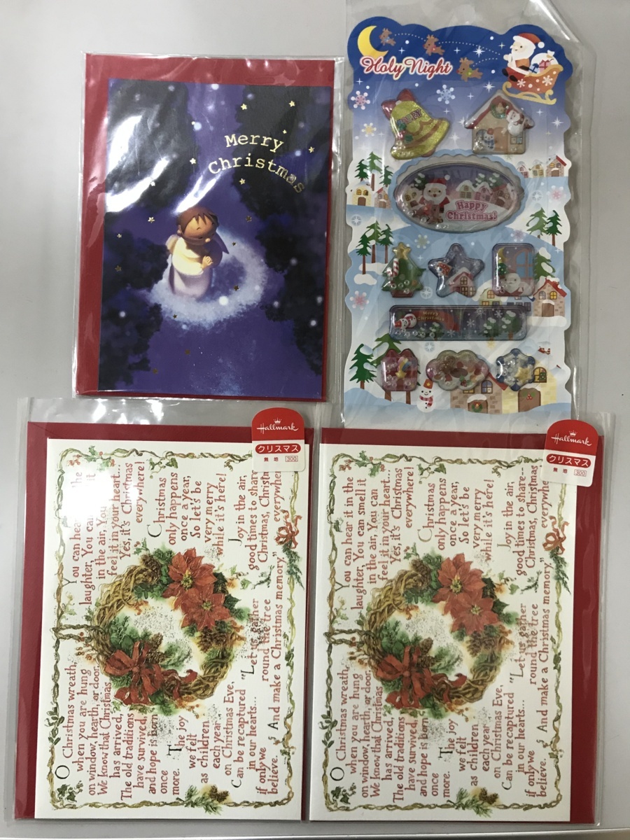 ★未使用品 ◎画像② ★メーカー= クローズ・ピン ★品名= クリスマス メッセージカード ★サイズ= ・封筒cm:縦約14cm×横約10.3cm ・メッセージカード:縦約13cm×横約9.2cm ★本体価格= ¥200×1点 --------------------------------------------- ◎画像③ ★メーカー= クラックス ★品名= ビーズ入り立体シール ★本体価格= ¥200×1点 --------------------------------------------- ◎画像⑤⑥ ★メーカー= ホールマーク ★品名= クリスマスカードメッセージカード ★サイズ= ・封筒cm:縦約15.5cm×横約10.8cm ・メッセージカード:縦約16.1cm×横約11.8cm ★本体価格= ¥300×2点 |