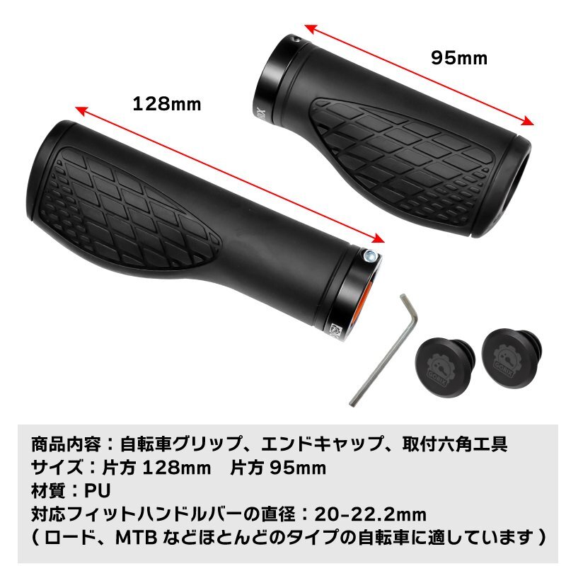 短めの自転車ショートグリップをお探しの方へ。 ロングサイズとショートサイズの組み合わせです。 ハンドル周りのシフト等で左右のハンドル露出サイズが異なる方に最適。 エルゴデザインで握りやすく疲れにくいグリップ。 手首の疲れや、腱鞘炎で悩んでいる方におすすめです。 掌の広さから親指まで心地よく握られ、体の重みが手の平にうまく分散し、痛みと疲れを大幅低減。 前傾姿勢も楽にキープできます。 クロスバイクやマウンテンバイク・ミニベロ・電動自転車などフラットハンドルの自転車に最適。 取付け工具付属ですぐに装着作業ができます。 [長さが違う組み合わせ] 左右の長さは異なるのでハンドル露出が異なる方に最適です。 ロング128mmとショート95mmの組み合わせです。 [エルゴデザイン] 手のひらをベタっと乗せて力を分散しとても楽に! 長時間の乗車も快適に。 [衝撃吸収] 程よい柔らかさで路面からの衝撃を吸収し体への負担を軽減。 グリップ表面に滑り止め加工を施しグリップ力を向上させます。 [装着しやすい] 内側の芯がグリップ装着時に通常のゴムタイプより滑りやすく 着脱作業がしやすい。 [しっかり固定] ネジで固定のロックオンタイプ。 ズレたりしないでしっかりと固定します。 [汚れや傷みに強い] 耐久性が高く、高強度で耐摩耗性に優れています。 商品内容グリップ、取付け工具、エンドキャップ 長さ片方ロング128mm/片方ショート95mm 材質PU フィットハンドルバーの直径20-22.2mm (ロード、MTBなどなどほとんどのタイプの自転車に適しています) カラーブラウン 《ご注意》 ・きつく締め過ぎないことをお勧めします。 ・商品は入荷によりキズがある場合があります。 その場合は保証対象外になりますのでご了承お願い致します。 ・ディスプレイ環境により実物と色が異なる場合が有ります。 ・入荷時期により予告無く一部仕様変更する場合が有ります。 ・本製品は単純構造につき日本語説明書が付属しません。 | |