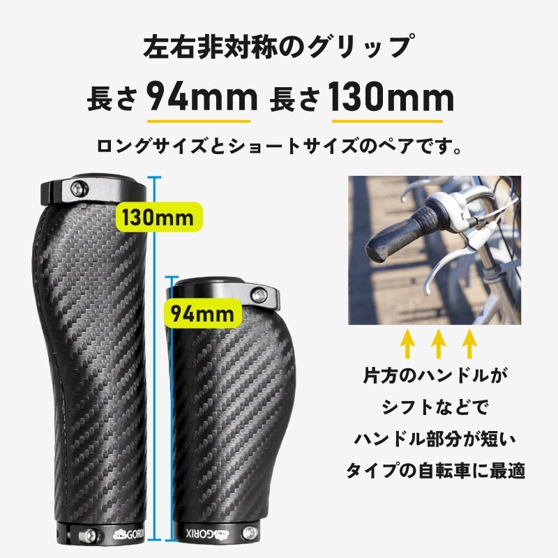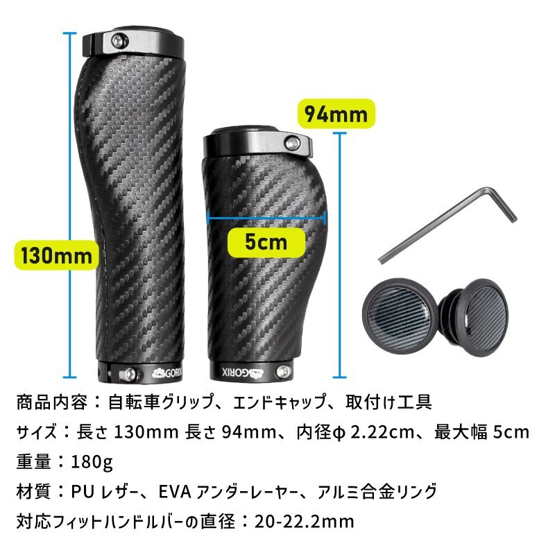 カーボン調柄が落ち着いた印象をあたえる自転車用グリップ。 左右の長さが非対称の長さ130mmと長さ94mmのタイプになります。 片方のハンドルにシフトなどがありハンドル部分が短くなっている(ハンドル周りのシフト等で左右のハンドル露出サイズが異なる方)自転車に最適です。 このグリップの特徴は長時間握っても疲れにくいエルゴデザイン。 滑らかな曲線が力を分散して手首をサポートします。 また手の平に接し体重が掛かる部分にシリコンクッションパッドを配置する事で地面からの衝撃を吸収し負担を軽減します。 表面はまるで本革のようなPUレザーを採用。軽量で弾力性もありソフトな握り心地。 クロスバイクやミニベロ、mtb、電動自転車やままちゃりに! [長さが違う組み合わせ] 左右の長さは異なるのでハンドル露出が異なる方に最適です。 ロング130mmとショート94mmの組み合わせです。 [エルゴデザイン] 長時間ハンドルを握り続ける手の平、また手首の負担やストレス軽減。 手の平をグリップにベタっと乗せる事により体の重みが手の平に分散し、痛みと疲れは大幅軽減。 [軽量で衝撃に強い] 衝撃吸収向上高弾力EVAアンダーレーヤーはクッション性と通気性が高い [ダブルロックオン] 両サイドをネジ止めする事でしっかりと固定されてズレる事もない。 またグリップの交換や装着作業がスムーズに行えます。 ネジを固定する六角工具は付属していてすぐに作業できる。 [様々な自転車に] フラットハンドルバーの直径:22.2mm ほとんどのタイプの自転車用フラットハンドルに適しています。 商品内容自転車グリップ、エンドキャップ、取付け工具 サイズ長さ130mm長さ94mm、内径φ2.22cm、最大幅5cm 重量160g 材質PUレザー、EVAアンダーレーヤー、アルミ合金リング 対応フィットハンドルバーの直径20-22.2mm 商品は入荷によりキズがある場合があります。 傷や細かい汚れが気になる方や神経質な方は入札をお控え下さい。 入荷時期により予告無く一部仕様変更する場合が有ります。 カラーはディスプレイ種類環境等により実物と異なって見える場合がございます。 |