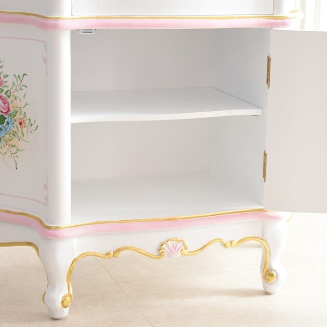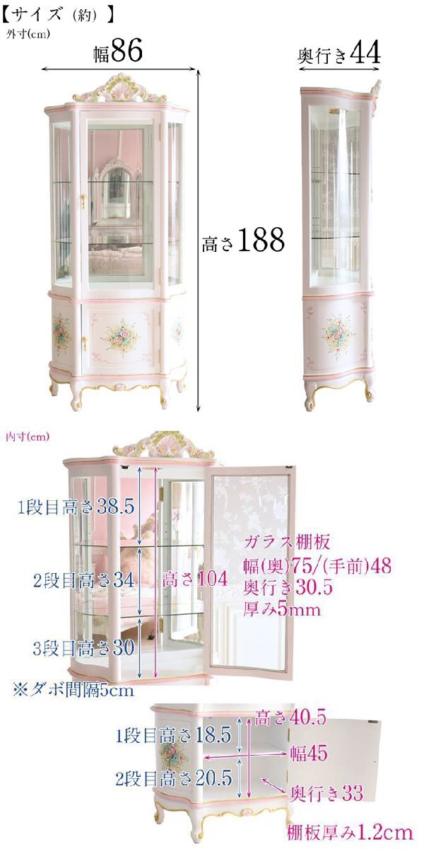 | 商品説明 | 優美で女性的な曲線美のロココ調家具です。 ヨーロッパの王宮がこよなく愛したその美しさは、現在でも熱烈な支持を得ています。 クラシック塗装が施され、ひとつひとつペイントされたハンドメイドの仕上がりが魅力です。 ゴールドのラインが、美しいシルエットを際立たせています。 ROCOCO様式の魅力がいっぱいつまった、イタリアンキャビネット♪ 上部は、ガラス扉・ガラス棚板・背面ミラーで見せる収納を実現! 内側天井に照明付きで、あなたの大切なものを美しく引き立てます。 下部は扉収納スペースなので、普段使わない物などを大切にしまっておけます。 サイズ:幅86×奥行き44×高さ188cm 材質:MDF ※落札価格に消費税が掛かります。 ※お使いのモニターや照明器具などで、実際の色とは若干異なって見える場合があります。 ※アウトレット商品のため、多少の色ムラ、小キズが見られます。使用には問題ありません。 ※ヤフオク以外でも販売していますので、出品中に在庫が無くなった際は、出品を取り消す事がございます。 |
