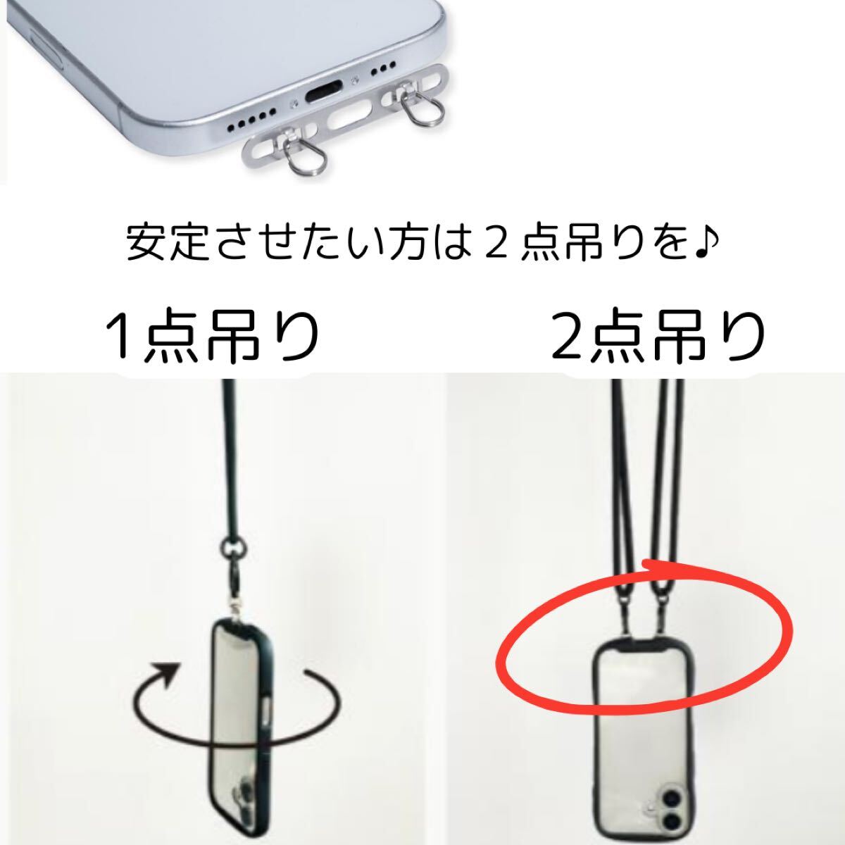 【2口タイプ】【1個】【超薄型】【即購入OK】ストラップを取り付ける場所がないケースをお持ちの方へ。スマホケースとスマホの間に簡単挟むだけ。ストラップを簡単に付けることができます。