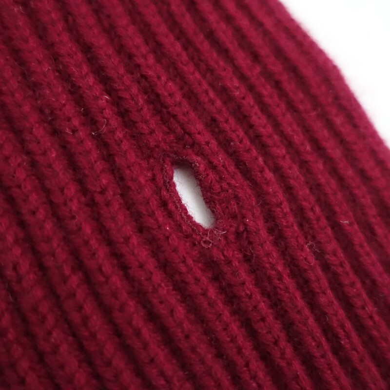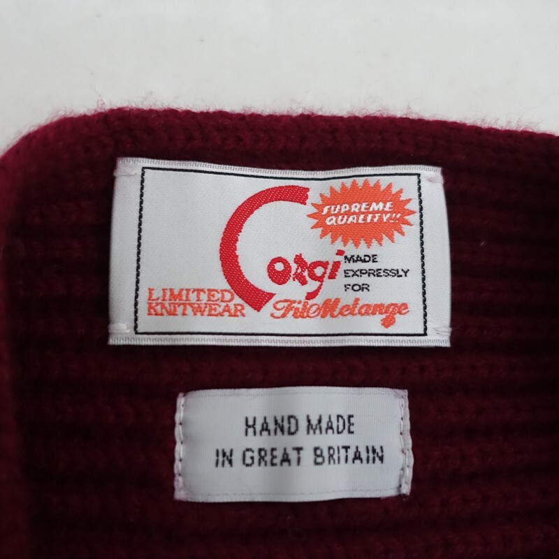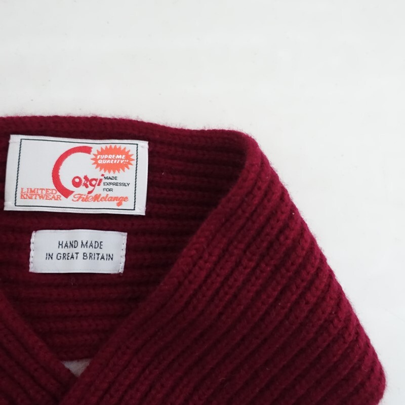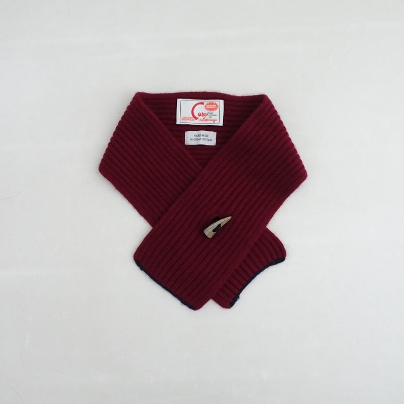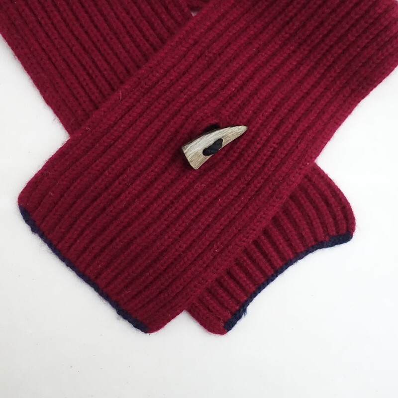 | FilMelange corgiのマフラーです。カラーはバーガンディで、両サイドにネイビーのラインが入っており、ニット素材であしらわれています。トグルボタンで留めていただくデザインです。 |