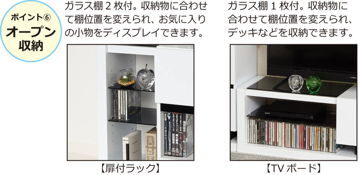 ガラス棚2枚付。収納物に合わせて棚位置を変えられお気に入りの小物をディスプレイ。