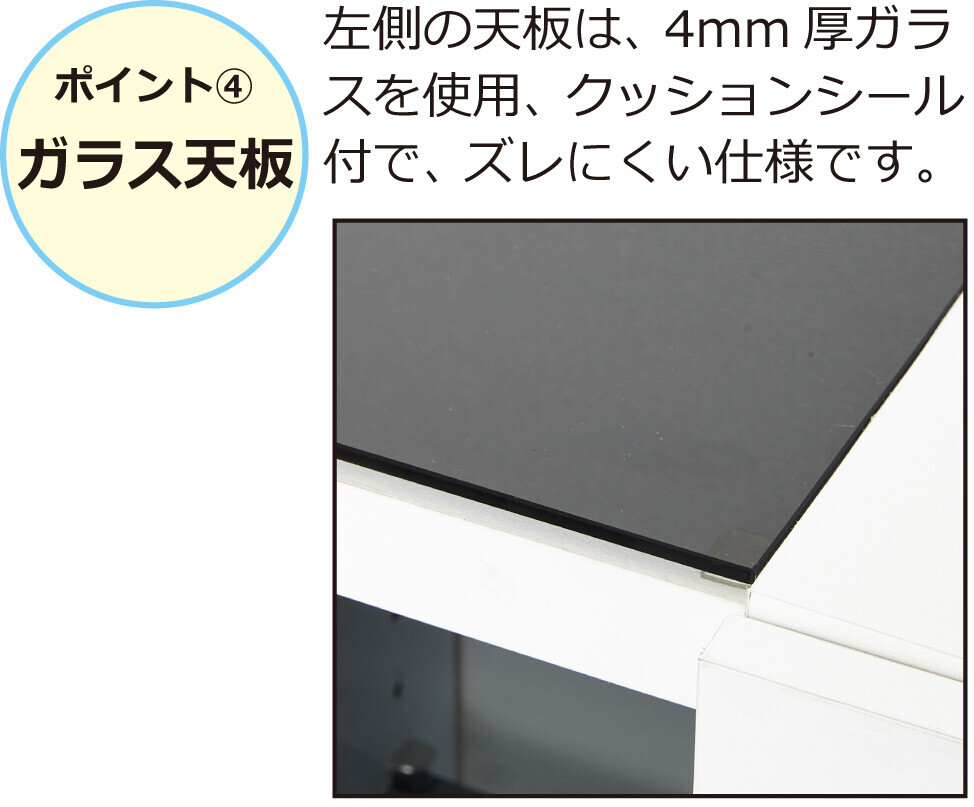 左側の天板は4mm厚のガラスを使用、クッションシール付でズレ難い。