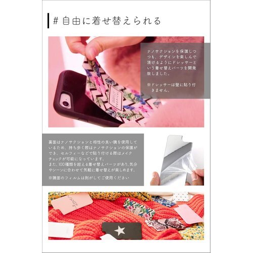 【!気分によって着せ替え!】表面のナノサクションと相性の良い鏡を利用した、着せ替えパーツをご用意。デザインが豊富なドレッサー、リング、カードケース、手帳など、たくさんの種類があり、気分やファッションによって着せ替えることが可能です。また裏面の鏡でどこでもメイクチェックが可能。