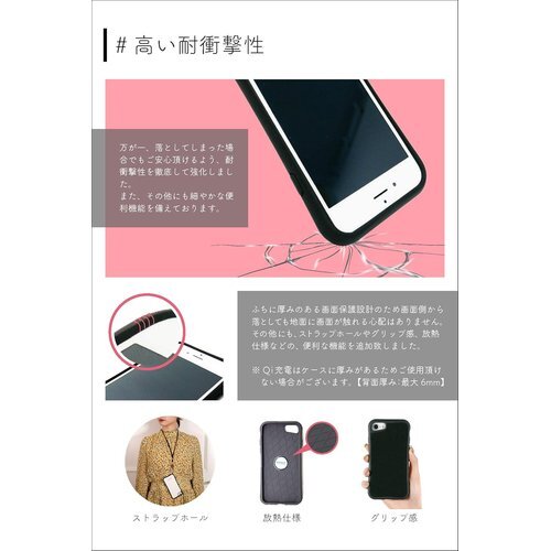 【!落ちても安心、耐衝撃設計!】側面に使われたTPU素材は耐久性と弾力性に優れ、衝撃を吸収するように設計されています。また画面破損の防止の為、画面側の枠部分に高さを出すことにより、スマホの液晶部分に直接地面が触れないような設計になっています。