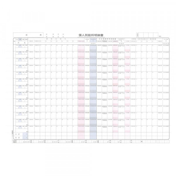 | 自動的に4つの業務(給与計算、賞与計算、年末調整、社会保険の算定・月変)が処理できます!1回の記入で、給料台帳・給料明細書・賃金台帳・源泉徴収簿貼付シートが一度に作成可能(ヨコ型ヨコ書き、13名連記、手当欄8、控除欄4)。別売りの給与K-2とセットでご利用ください。 |