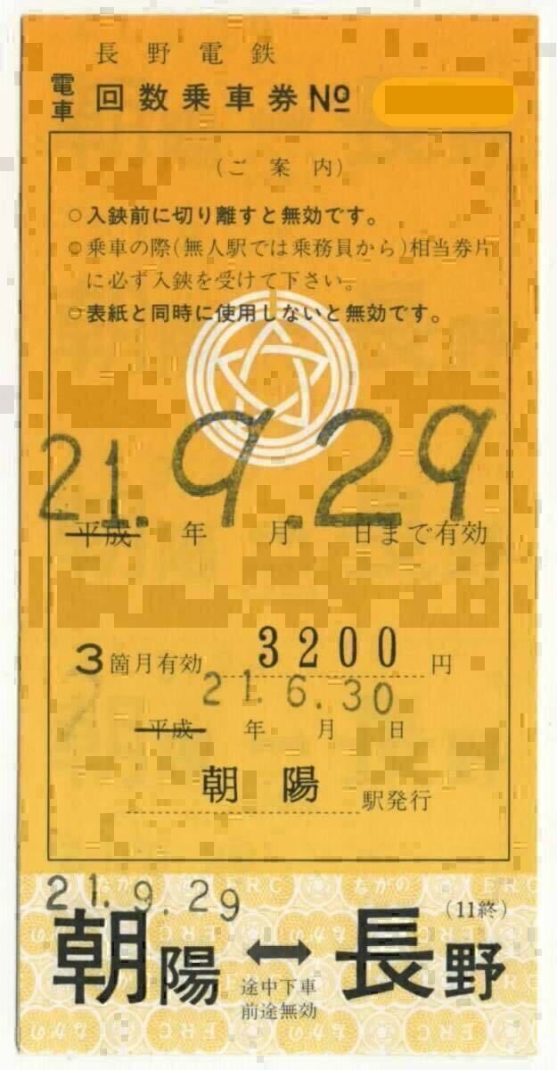 【長野電鉄】2021年6月無人化/朝陽駅発行 常備回数券(朝陽⇔長野)