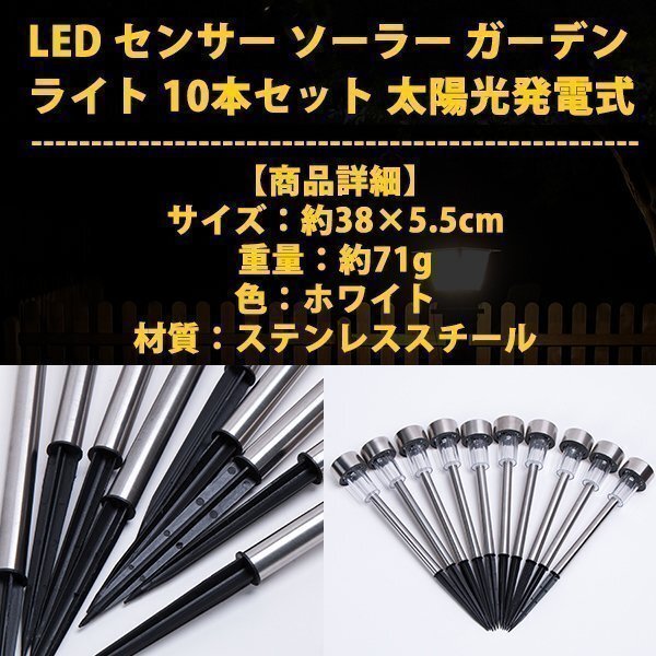 LED センサー ガーデンライト 10 本 セット 太陽光 屋外 防水 ソーラー 充電 式 庭園灯 自動点灯 白 ホワイト シンプル メタル シルバー